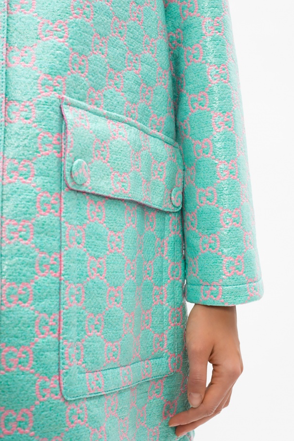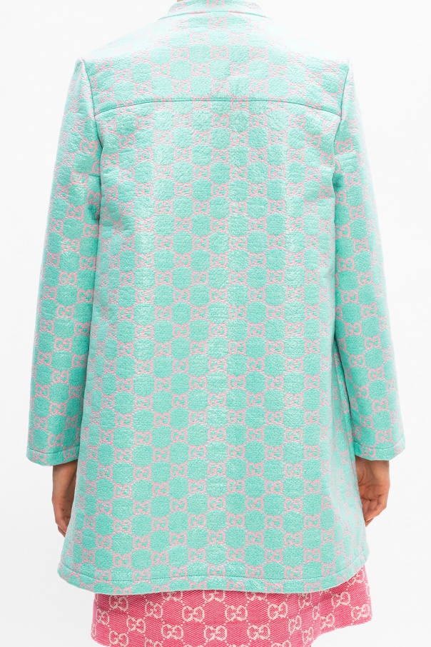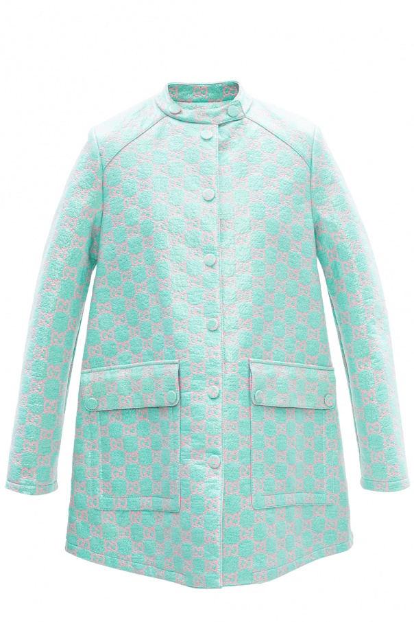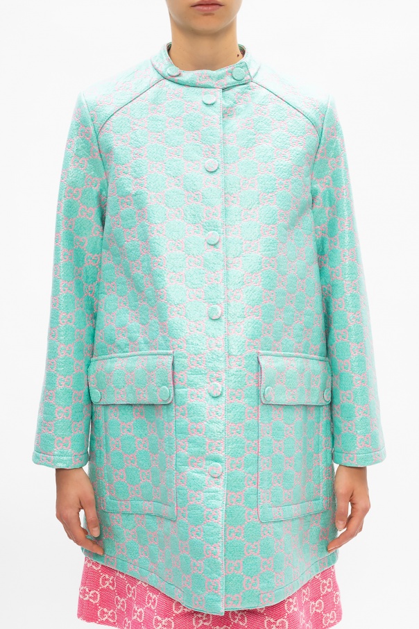 Light blue coat from Gucci. Boasting GG logo detailing all over, this tweed-crafted piece of outerwear employs press-stud fastening, band collar, two press-stud fastened flapped pockets, long sleeves and water-resistant, glossy coating.