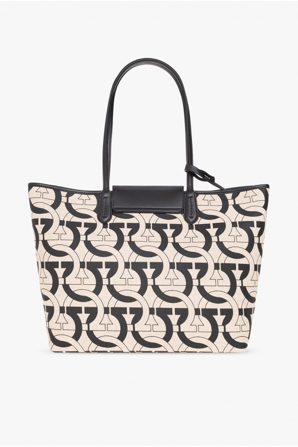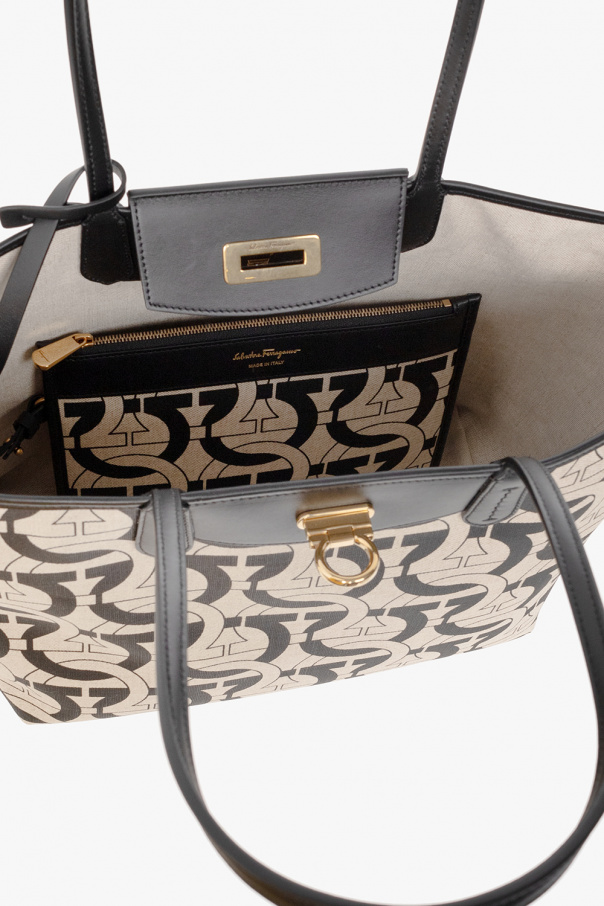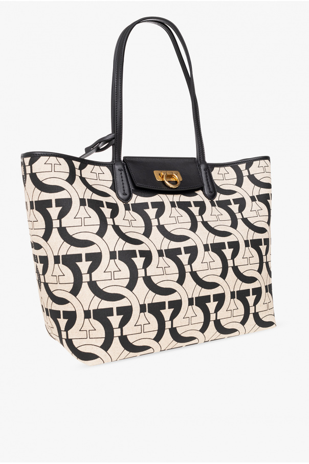 Cream and black shopper bag from FERRAGAMO. Crafted from a linen blend, this design showcases a snap fastening, a monogram pattern, two half-round handles, gold-tone metal hardware and one internal compartment with a zip pocket.