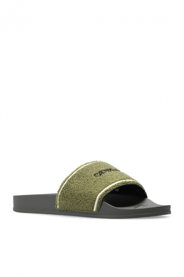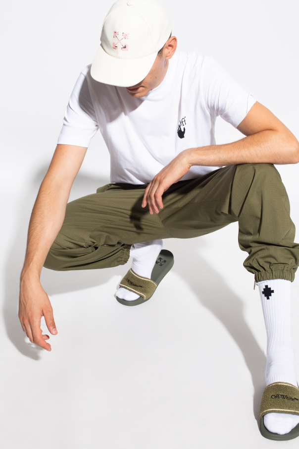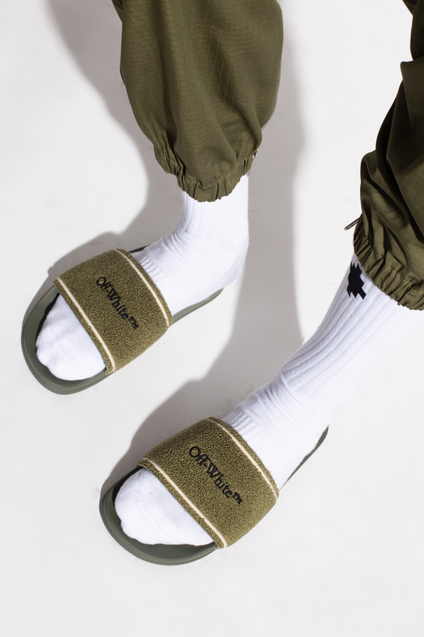 Green and cream slides from Off-White. Crafted from rubber and fabric, they showcase an embroidered logo.