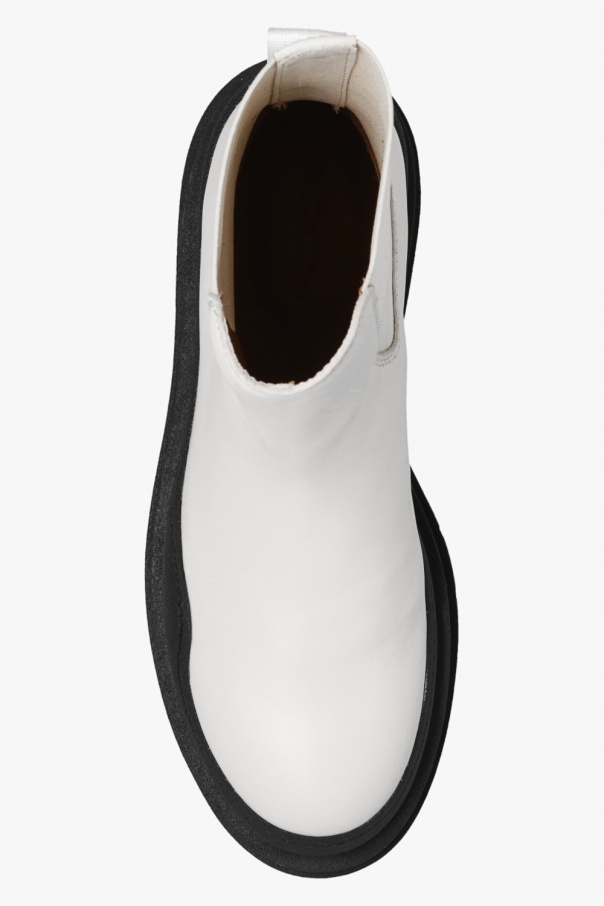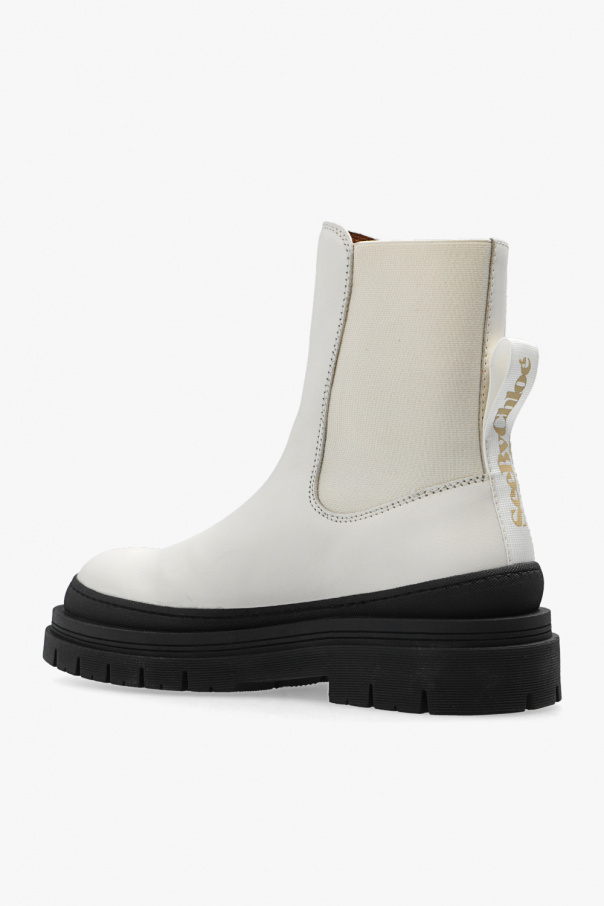 Cream ‘Alli’ Chelsea boots from See By Chloe. Crafted from leather, this model sits on a black rubber sole and features elastic panels on the sides and a fabric insert with a printed logo at the back.