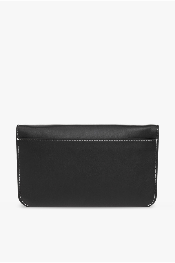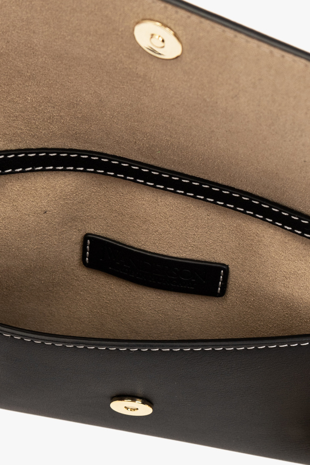 Black phone pouch from J.W. Anderson. Made of calf leather, this item features a snap closure, decorative contrasting seams in white, logo print, back pocket, adjustable shoulder strap with a chain link detail and silver-tone metal hardware.