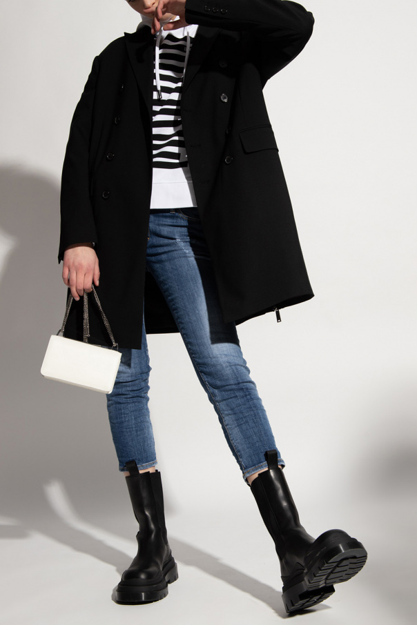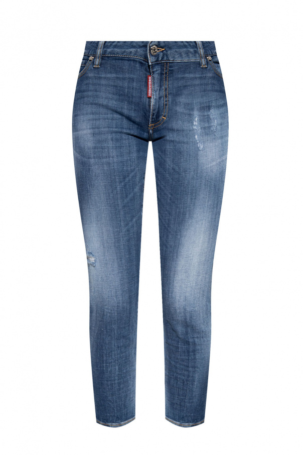 Blue ‘Medium Waist Cropped Twiggy Jean’ distressed jeans from Dsquared2. Fastened with a zip and button, this cropped tapered leg design is complete with crystal-embellished appliqués, three front pockets and two back pockets, one with a metal logo in silver-tone.