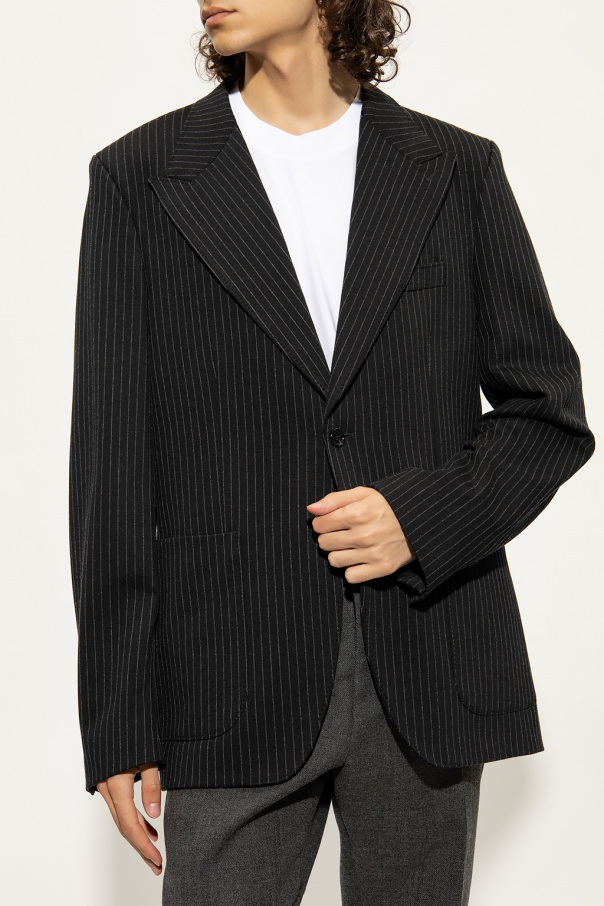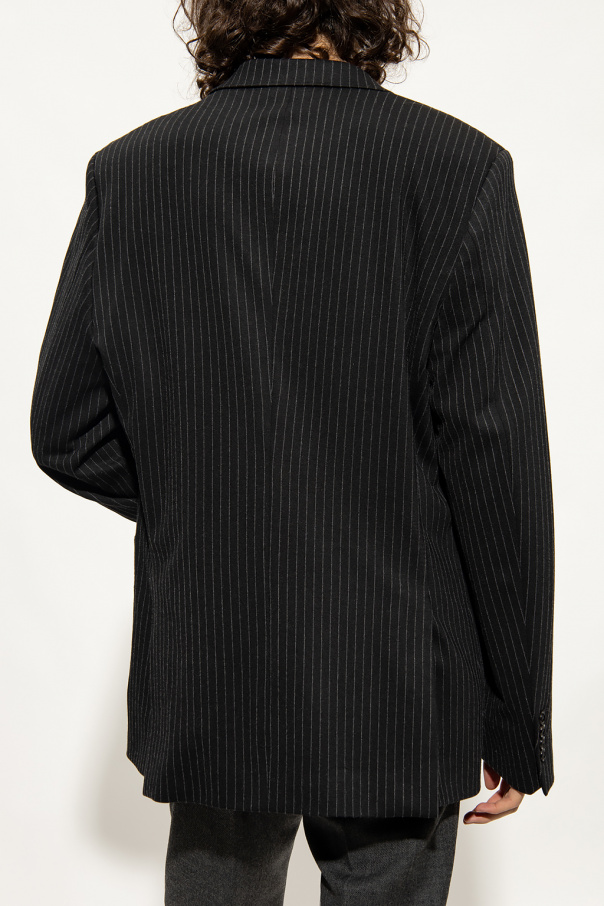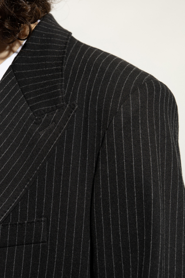 Black blazer with peak lapels from Dolce & Gabbana. Fastened with buttons, this garment features a light grey pinstripe pattern, three front pockets, long sleeves and double rear vent.