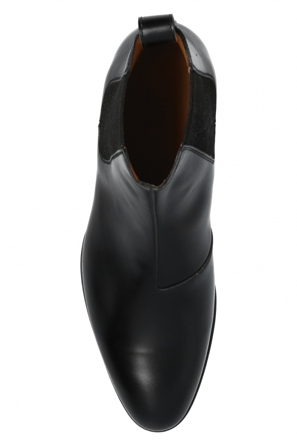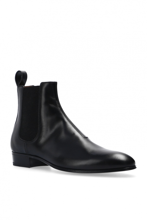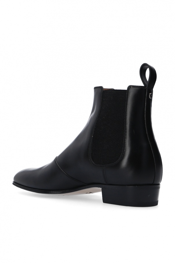 Black ankle boots from Gucci. Crafted from leather, this pair features slip-on silhouette with silver-tone logo plaque, elastic inserts and beige leather sole.
