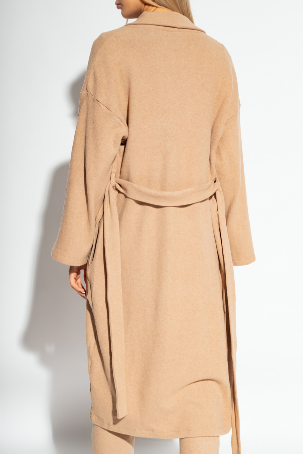 Beige bathrobe from Hanro. Crafted from a cotton blend, this style features a waist-cinching belt, a shawl collar, two slip pockets and long sleeves.