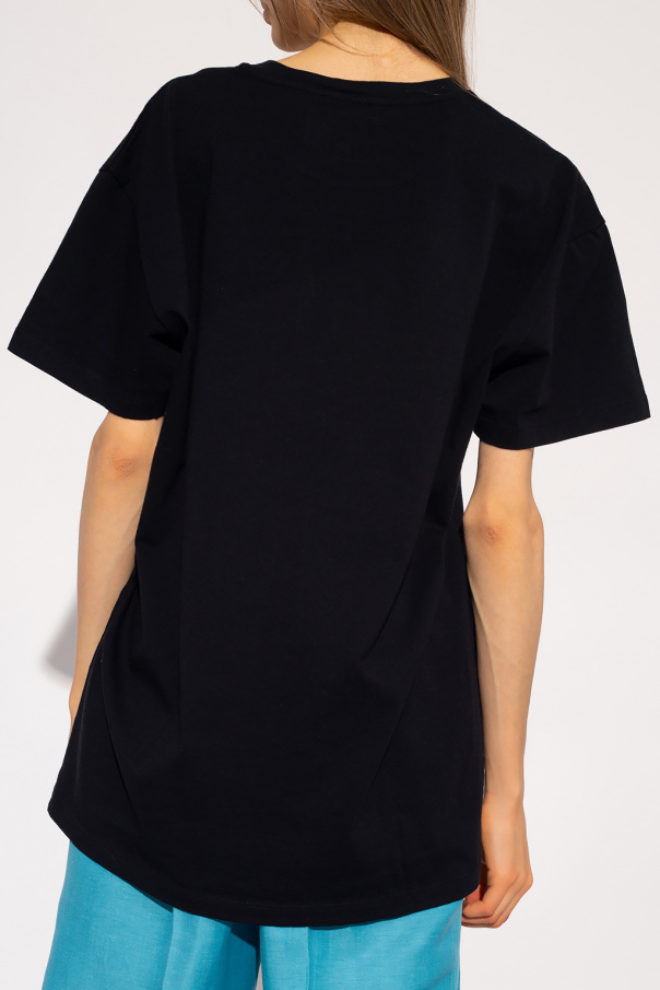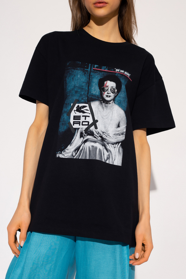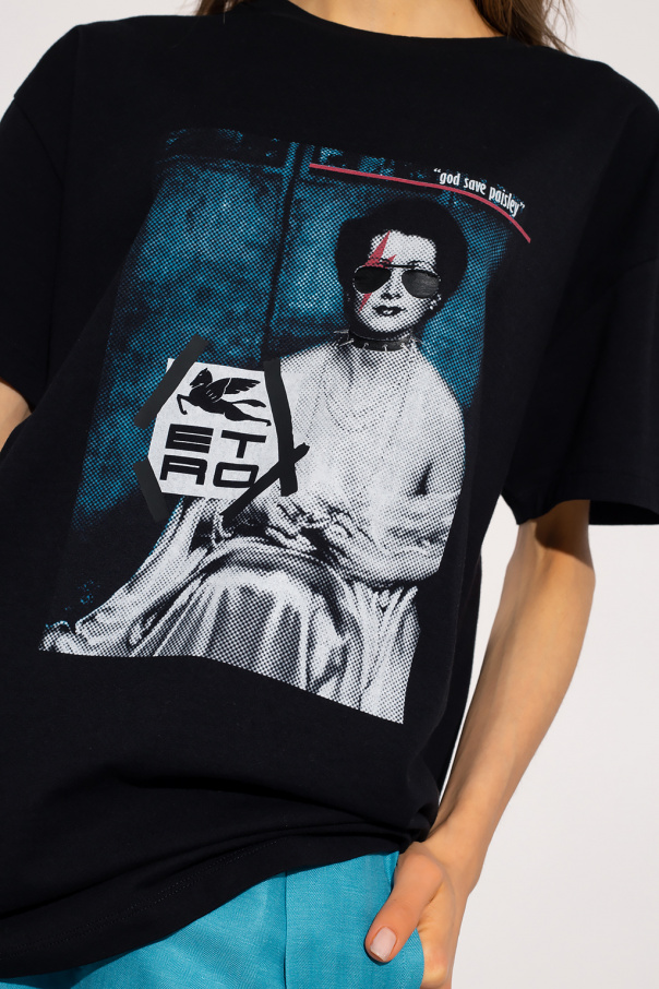 Black crewneck T-shirt from Etro. Made of cotton, this style features short sleeves, an elasticated collar, laminated details, the ‘Etro Cube’ logo and a colourful graphic print inspired by the Victorian era and reinterpreted in punk-style.