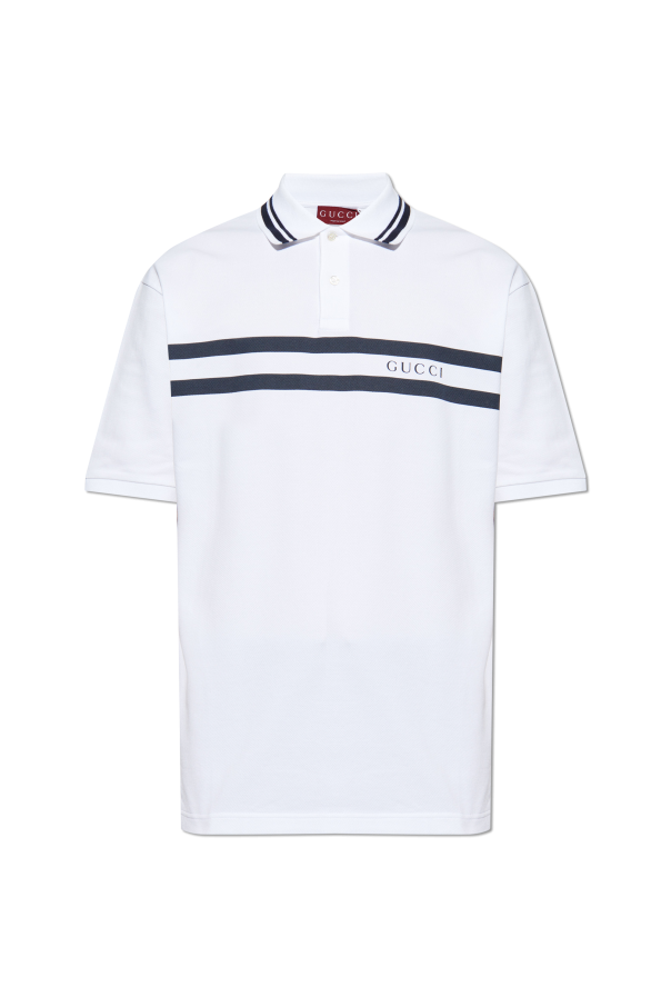 Introducing the epitome of sartorial elegance, the Gucci Logo Polo Shirt. This exquisite garment, rendered in pristine white, showcases the impeccable craftsmanship synonymous with the storied house of Gucci. Meticulously crafted from premium materials, primarily soft cotton, this polo ensures unparalleled comfort and enduring quality. The classic silhouette, featuring short sleeves and a relaxed fit, exudes a timeless charm suitable for a myriad of occasions. The design is distinguished by its understated yet striking details: two horizontal navy stripes adorn the front, complemented by the iconic GUCCI logo emblazoned on the left chest between the stripes. The collar, accented with navy edges, adds a touch of refined sophistication, while two pristine white buttons complete the look. Additional features include a traditional polo collar with button fastening, short sleeves with subtle ribbed cuffs, and a smooth back devoid of embellishments, highlighting the shirt\'s minimalist elegance. The edges are meticulously finished, underscoring the high quality of the piece. Why Choose This Product? Expertly crafted from high-quality cotton for superior comfort. Elegant design with distinctive navy accents and the iconic GUCCI logo. Classic cut with short sleeves and a relaxed fit for versatile styling. Attention to detail with a finely finished collar and edges. A timeless addition to any sophisticated wardrobe.