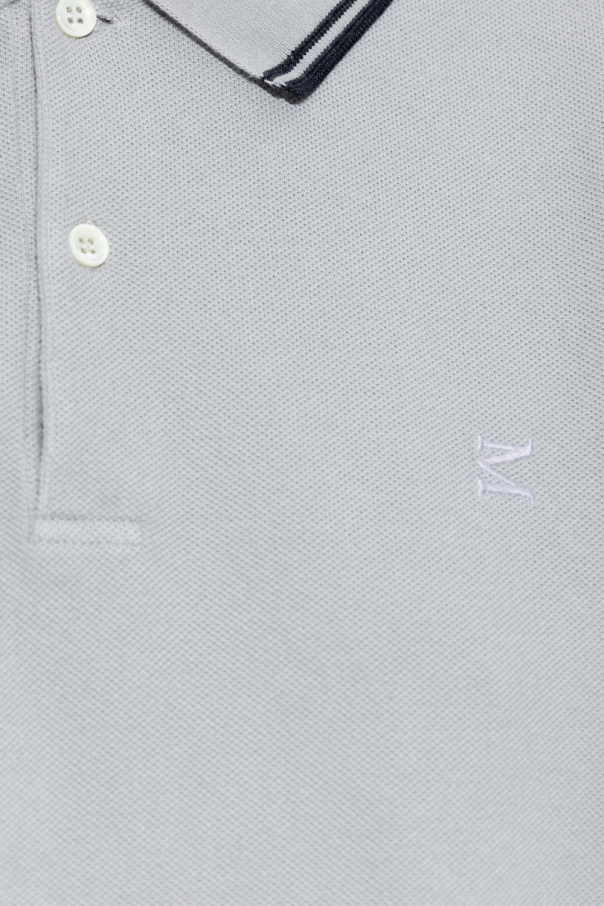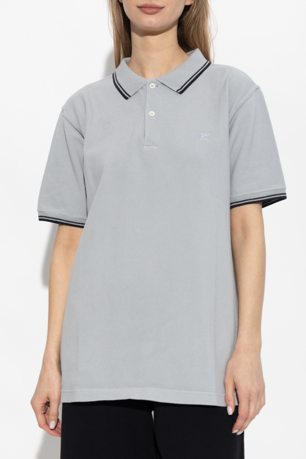 Grey and black polo shirt from Maison Margiela. Crafted from cotton, this style features a collar with a button placket, logo embroidery on the front, side slits and short sleeves.