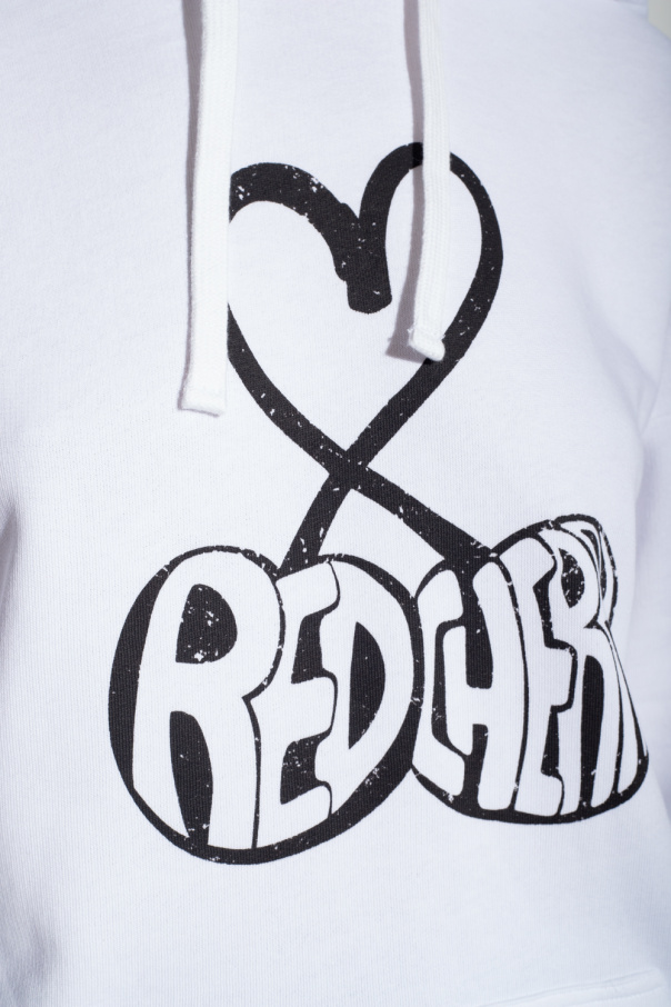 White loose-fitting hoodie from Red Valentino. Crafted from cotton, this garment features a drawstring hood, black tulle with the label’s signature Point d’Esprit pattern, black print with a cherry, heart and logo motif, slip pocket and ribbed trims at the hem and cuffs.
