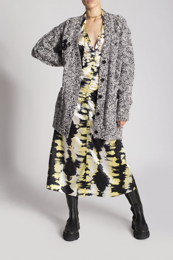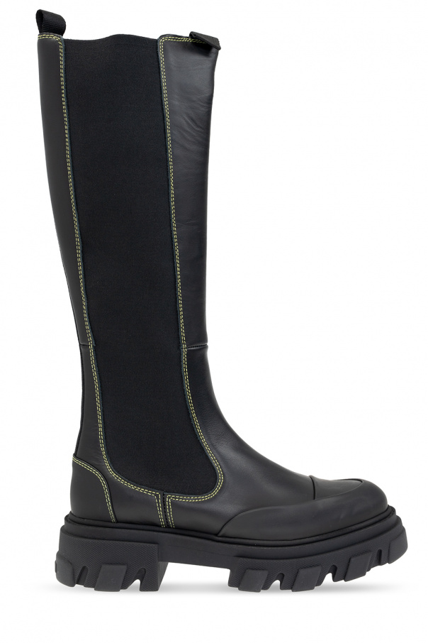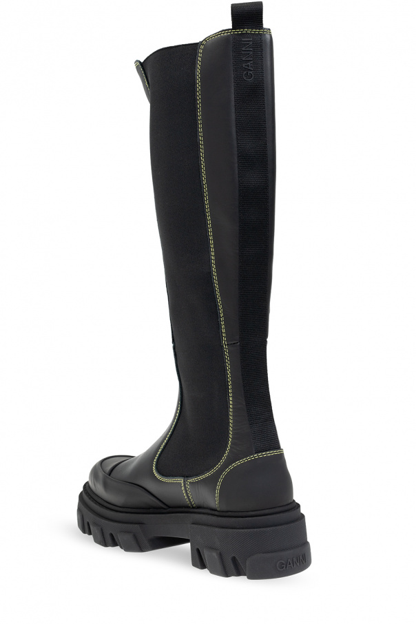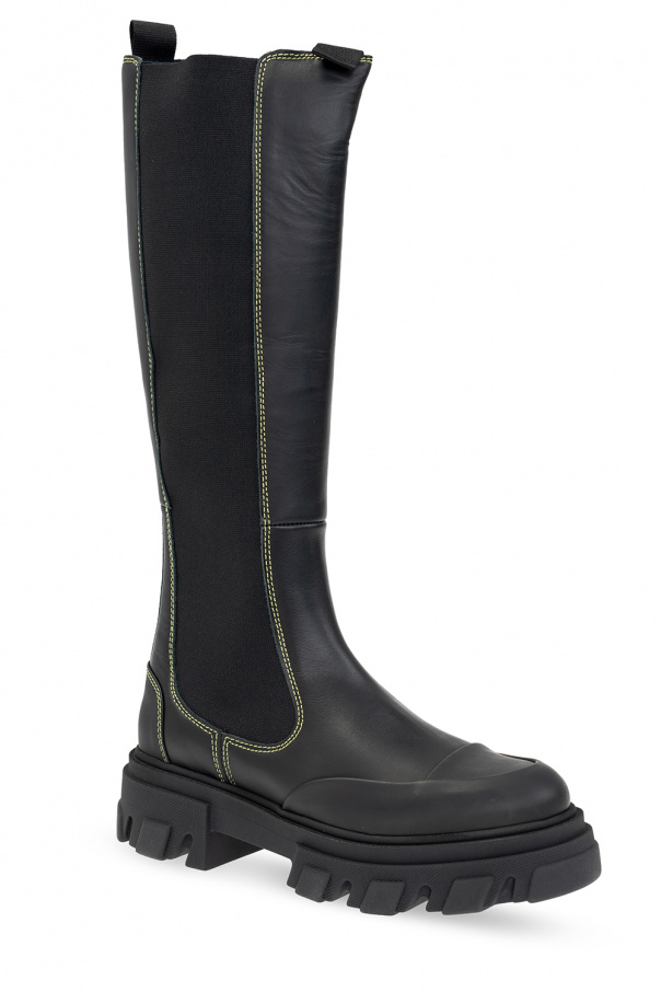 Black Chelsea boots from Ganni. Crafted from leather, this pair features elastic side panels, yellow stitching details, raised logo at the back and a black rubber sole.