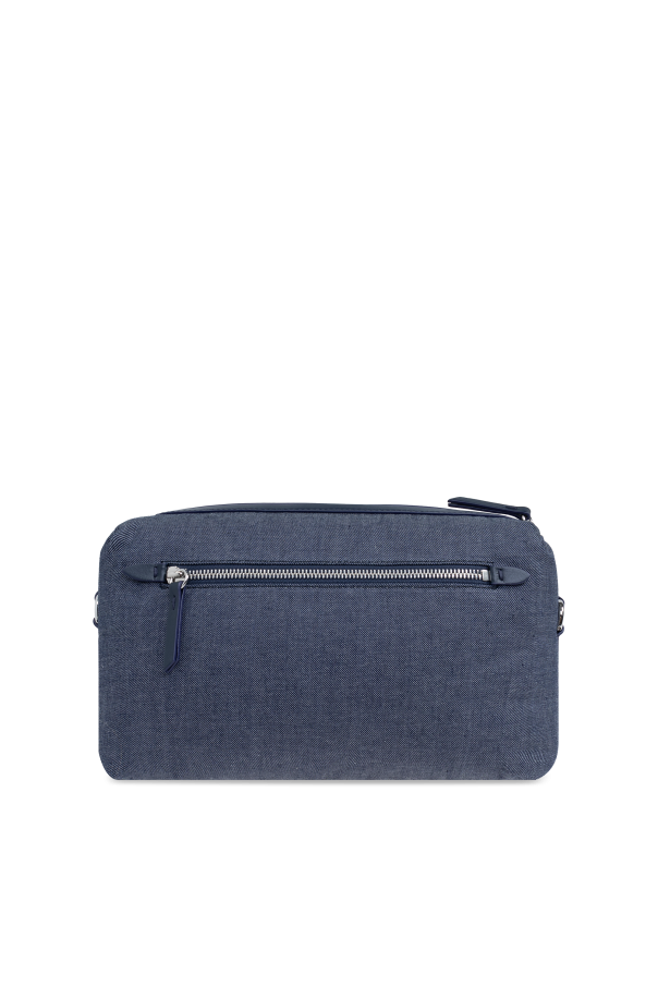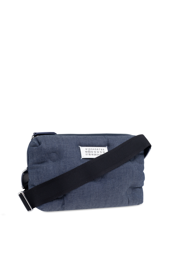 Introducing the Micro Glam Slam Shoulder Bag by Maison Margiela, a testament to the blend of functionality and refined style. Crafted with a high-quality material that mimics the durability and texture of denim or heavy canvas, this navy and black bag is designed to withstand the rigors of daily use while maintaining an elegant aesthetic. The bag\'s rectangular shape with rounded corners and a subtly convex profile lends it a structured yet soft appearance. Its front is adorned with a white rectangular patch featuring the black print logo of Maison Margiela, signifying the brand\'s signature and authenticity. A contrast to the navy body, the adjustable wide black shoulder strap enhances practicality and ease of carrying. Security is paramount, with the main compartment secured by a zipper closure. The interior, finished in a dark hue for easy maintenance, houses an internal compartment and a zipped pocket, alongside a branded tag confirming its authenticity. Furthermore, an additional external pocket with a magnetic snap closure offers quick access to frequently used items, elevating the bag\'s functionality. Why Purchase This Product? Durable material and construction for long-lasting use. Elegant design with Maison Margiela\'s signature logo. Practical adjustable shoulder strap for comfortable carrying. Multiple compartments for organized storage. External pocket for easy access to essentials.