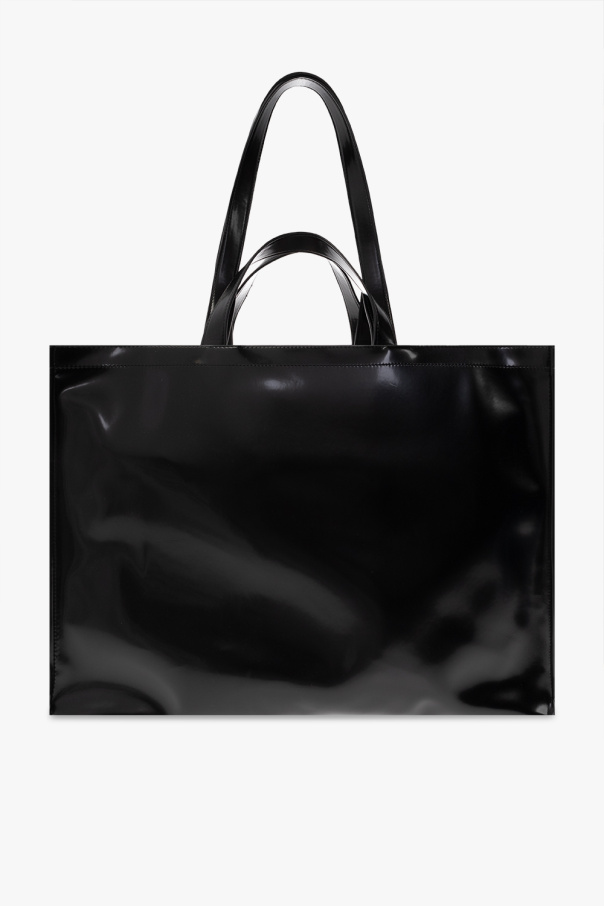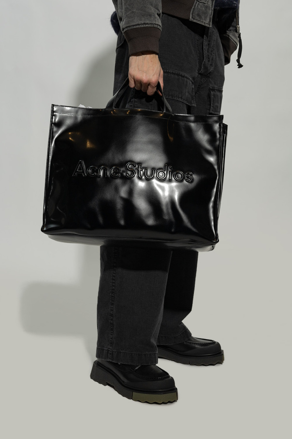 Black shopper bag from Acne Studios. Crafted from glossy material, this design fastens with a snap and showcases a raised logo on the front, four handles, silver-tone metal hardware and one internal compartment with one slip pocket and one zip pocket.