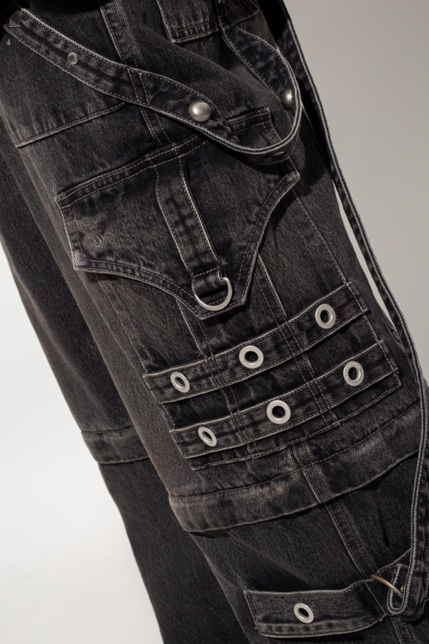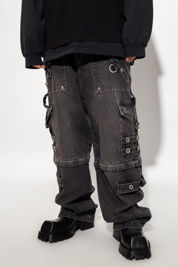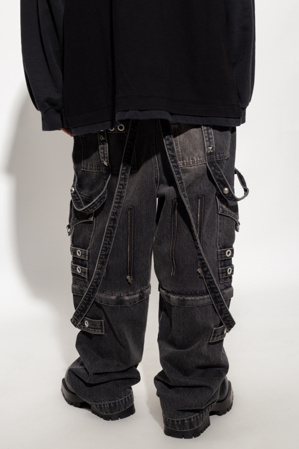 Grey baggy jeans from Balenciaga. Made of organic cotton from Japan, this pair features a button and zip closure, studs and metal elements in silver-tone, two detachable shoulder straps, four slip pockets, two flap pockets, zips for an adjustable fit and detachable legs. Can also be worn as shorts.