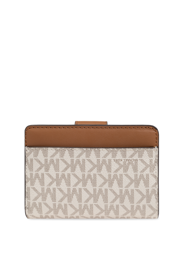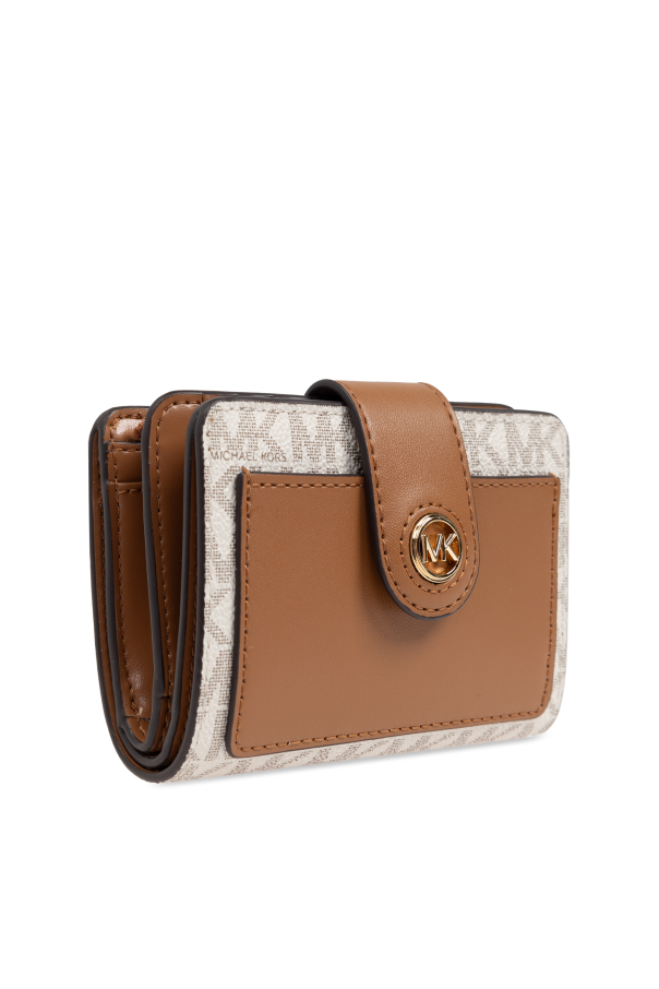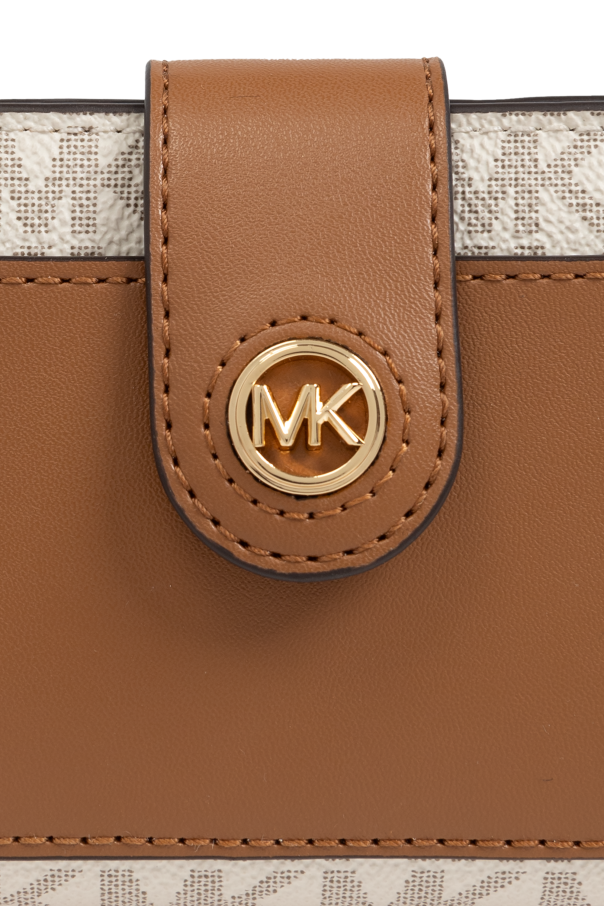 Experience the epitome of sophistication with the exquisite Michael Michael Kors Logo Wallet. This distinguished accessory features a refined rectangular shape adorned with a recurring designer logo pattern in a light hue, ensuring an unmistakable touch of elegance. Crafted from premium materials, this wallet showcases an exterior with a smooth brown leather panel and a protective flap. The flap is embellished with a round gold logo emblem embossed with the initials \"MK\", while the interior features a gold-stamped \"MICHAEL KORS\" logo on one of the compartments. The wallet is designed for functionality without compromising on style, offering several card slots, a zippered coin pocket, and a secure snap closure. The dominant brown color both externally and internally exudes a timeless charm. Why Choose This Product? High-quality craftsmanship with premium materials. Elegant design featuring the iconic Michael Kors logo. Multiple compartments for practical organization of cards, coins, and bills. Secure snap closure for added safety.