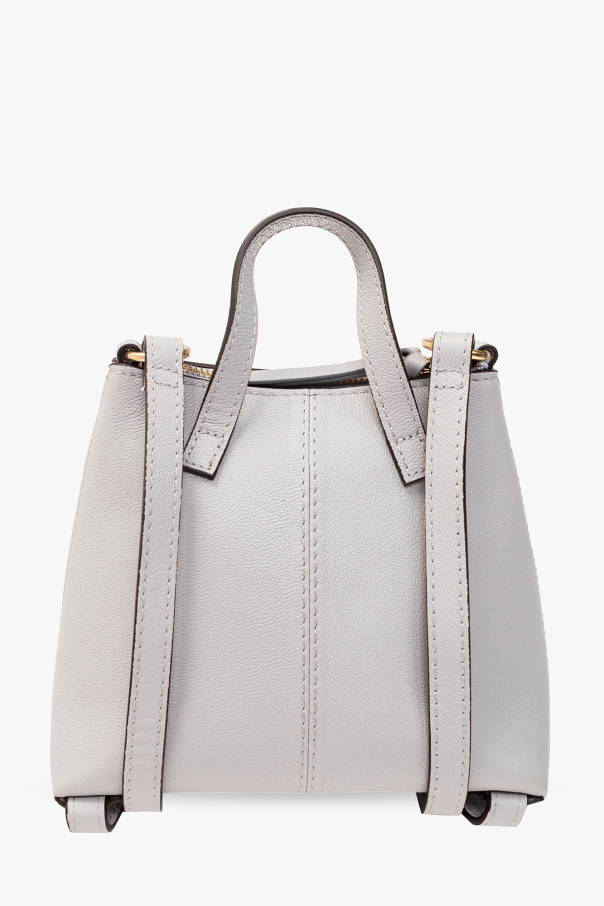 Light grey ‘Joan’ backpack from See By Chloe. Crafted from leather, this design secures with a zipper and features a frontal pocket with a leather-covered ring and logo charms on the front. It is complete a half-round handle, adjustable shoulder straps, gold-tone metal hardware and one internal compartment with three card slots.