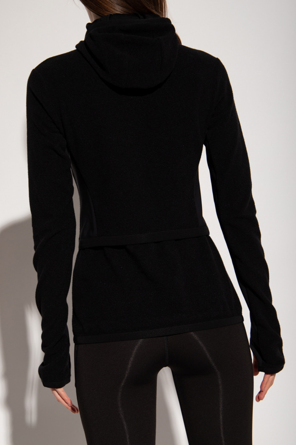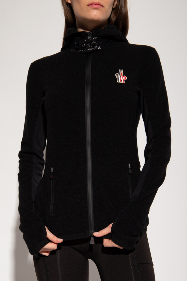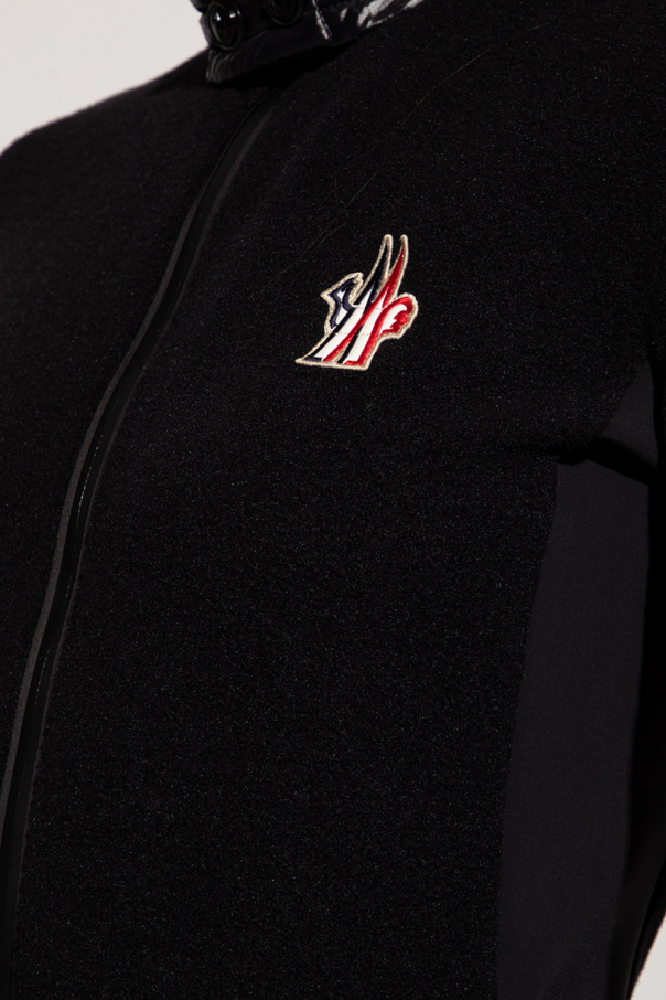 Black hoodie from Moncler. Emblazoned with a cream, red and navy blue logo patch, this style features a two-way zip fastening, two zipped pockets and long sleeves.