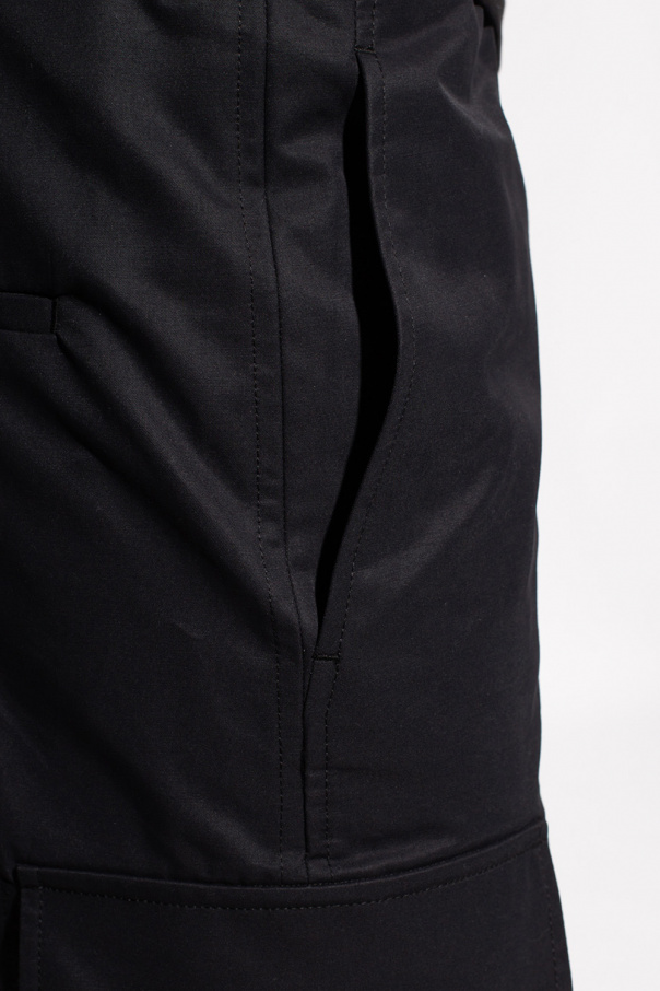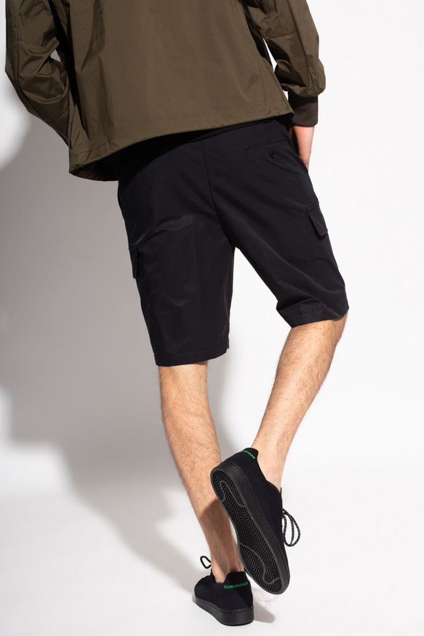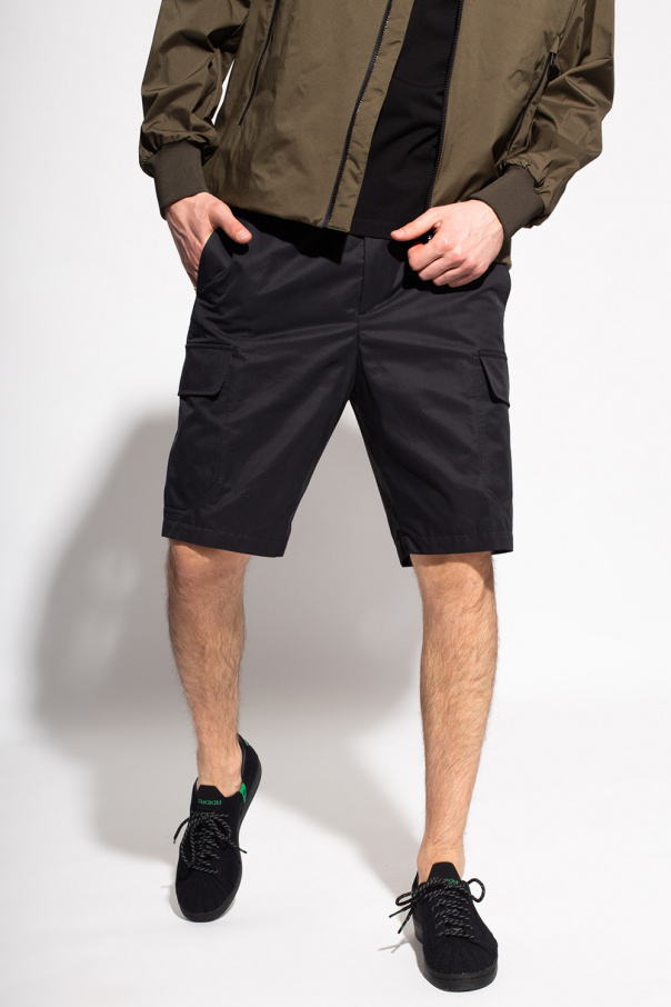 Black shorts from Neil Barrett. Made from a cotton blend, this pair features an elasticated waistband with a drawstring fastening, short legs and five pockets: two slip ones, two flapped ones and one with buttons.