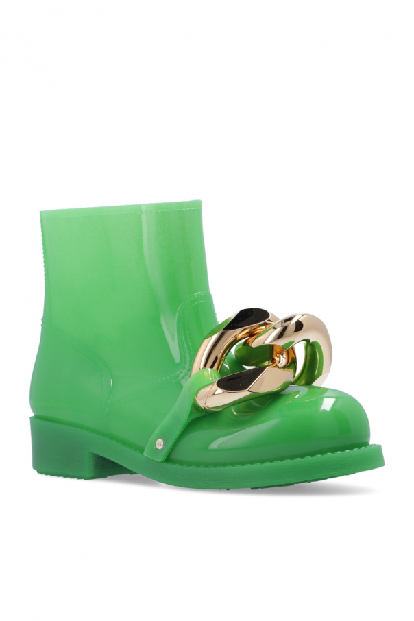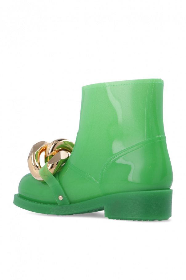 Short, green rain boots from JW Anderson. Resting on a green rubber sole, this pair features a metal appliqué with gold-tone chain links.