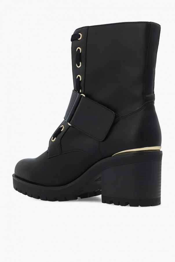 Black heeled ankle boots from Versace Jeans Couture. Fastened with a zip and velcro, this lace-up pair features zip and velcro fastening, decorative logo appliqué in gold-tone and black rubber sole.