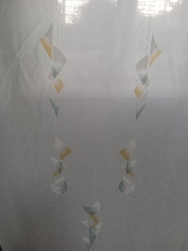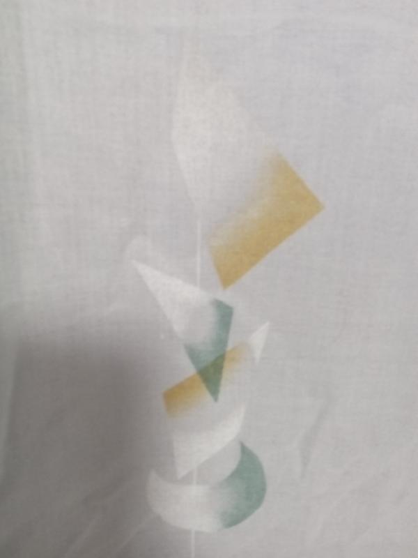 достаточно большая и на высокую стену, непрозрачная как тюль,рисовок абстракция, складывается из двух сшитых полотен,края обработанные, сверху тесьма липучка,стан очень хорош