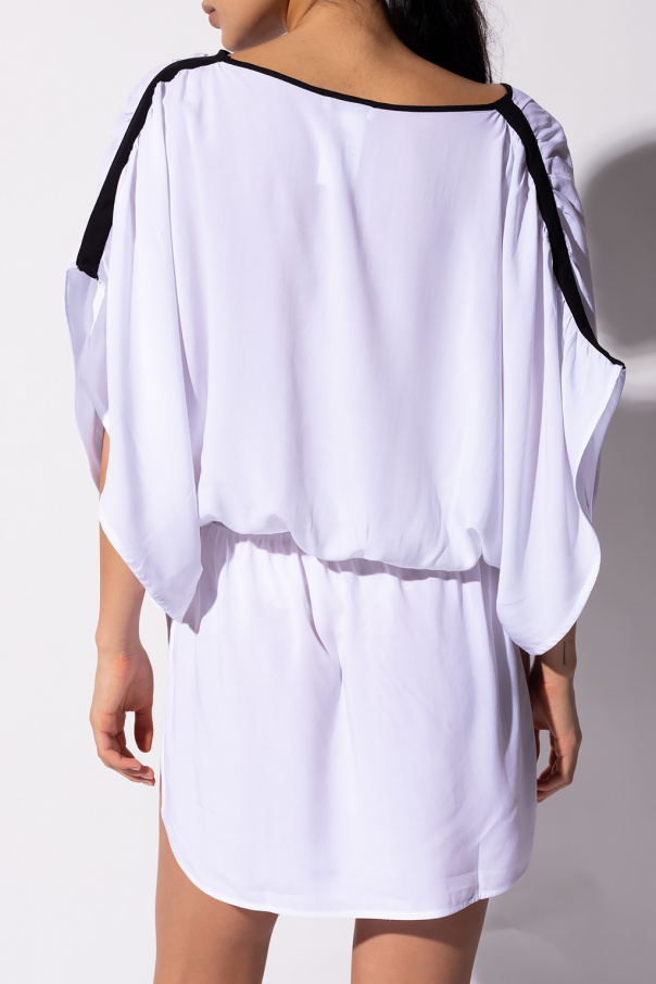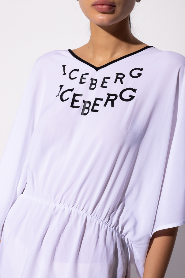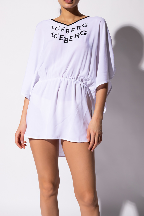 White and black short beach tunic from Iceberg. This V-neck design is complete with a black logo print, short sleeves and an elastic waistband.