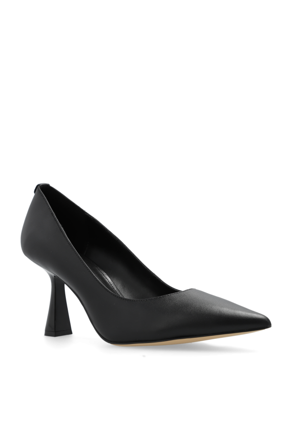 Black ‘Clara’ pumps from Michael Michael Kors. Crafted from smooth leather, this pointed toe pair features a metal logo detail in gold-tone at the back and a light beige leather sole.