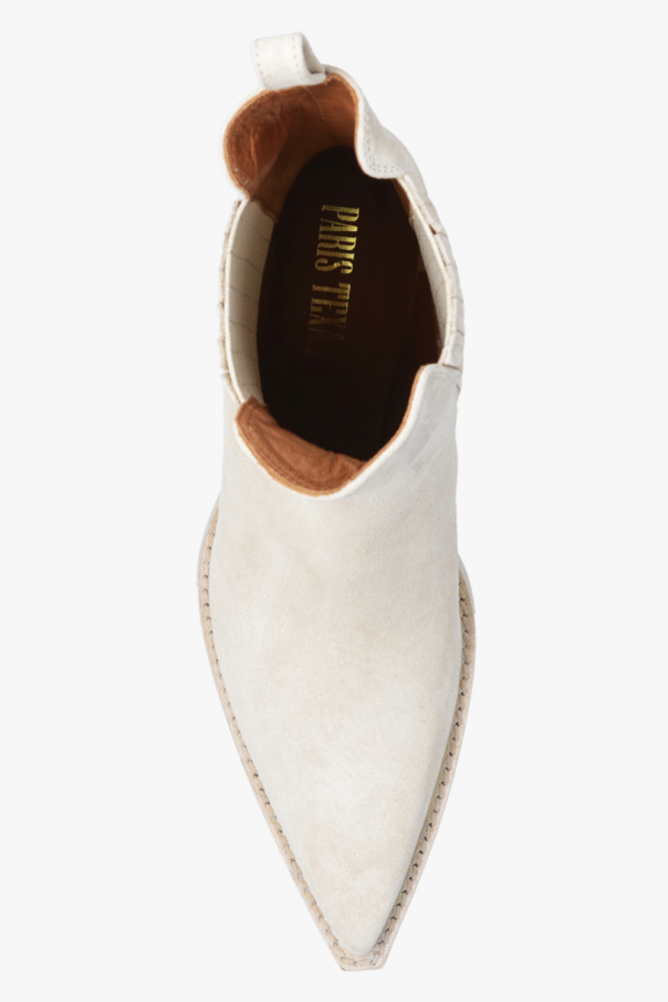 Cream ‘Dallas’ heeled ankle boots from Paris Texas. Made of calf suede, this pair features elastic side panels, pointed toe and cream leather sole.