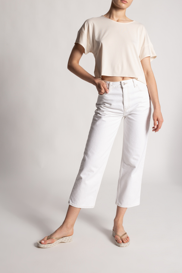 White, grey and gold-tone ‘Lilo’ platform flip-flops from Michael Michael Kors. Resting on a white rubber sole, this pair is enriched by metal and printed logo details.
