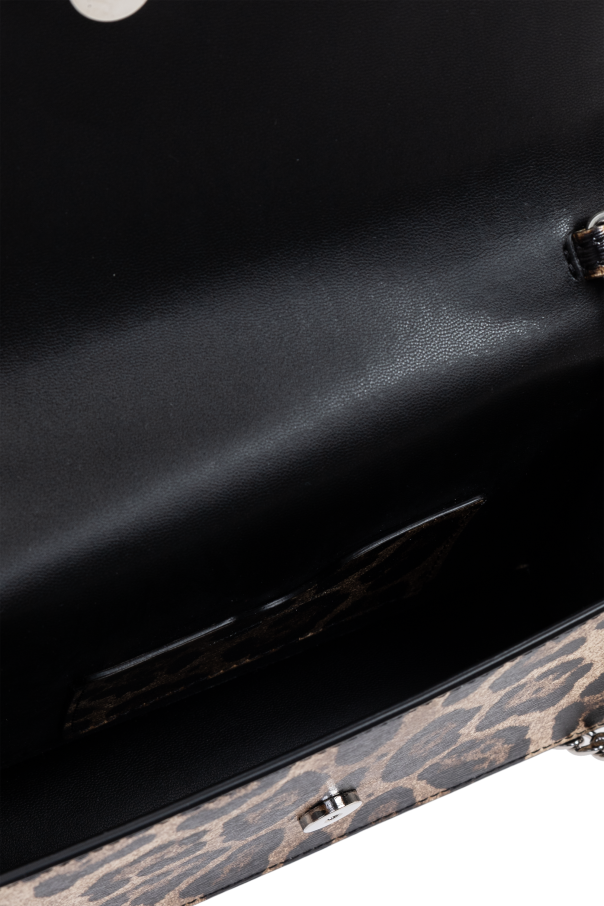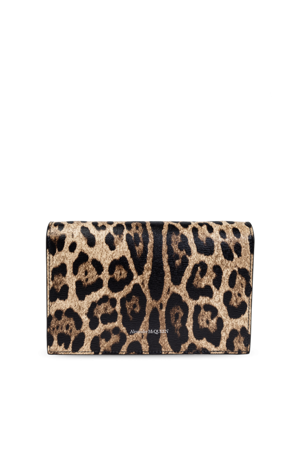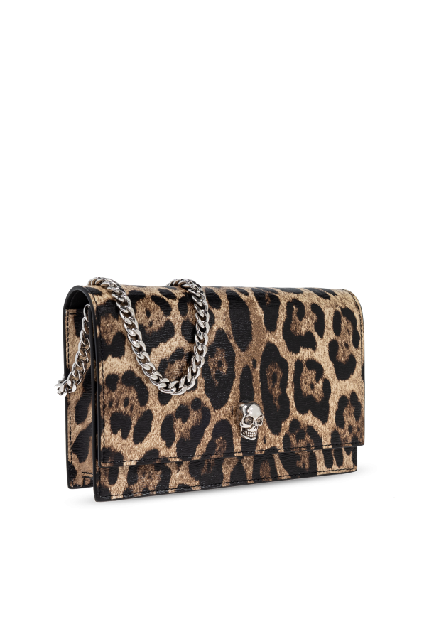 Introducing the ‘Skull Small’ Clutch by the illustrious Alexander McQueen, a masterpiece that encapsulates both luxury and an edgy aesthetic. This clutch stands out with its captivating brown leopard motif, set against a backdrop of high-quality fabric that mimics the luxuriousness of animal fur. The blend of darker browns and blacks within the pattern creates a mesmerizing visual texture that is both sophisticated and bold. The centerpiece of this clutch is its distinctive metal skull closure, adorned with eye-catching jewels that resemble zirconia, adding a touch of opulence and rebellion. This feature is not just a testament to McQueen\'s iconic design ethos but also serves as a functional closure that keeps your belongings secure. Complementing its stunning design is a silver-colored metal chain, offering versatility and ease of carrying, whether draped over the shoulder or held in hand. Not merely a statement piece, the ‘Skull Small’ clutch is thoughtfully designed with practicality in mind. Its interior houses a compartment with a dedicated space for cards, secured by a magnetic closure, ensuring your essentials are organized and accessible. Why Purchase This Product? Luxurious design with a high-quality, animal fur-like fabric and a captivating leopard print. Iconic skull closure embellished with jewel-like stones, reflecting Alexander McQueen\'s signature aesthetic. Versatile carrying options thanks to its elegant metal chain. Practical interior compartment with space for cards, secured by a reliable magnetic closure.
