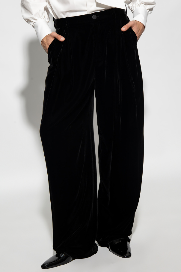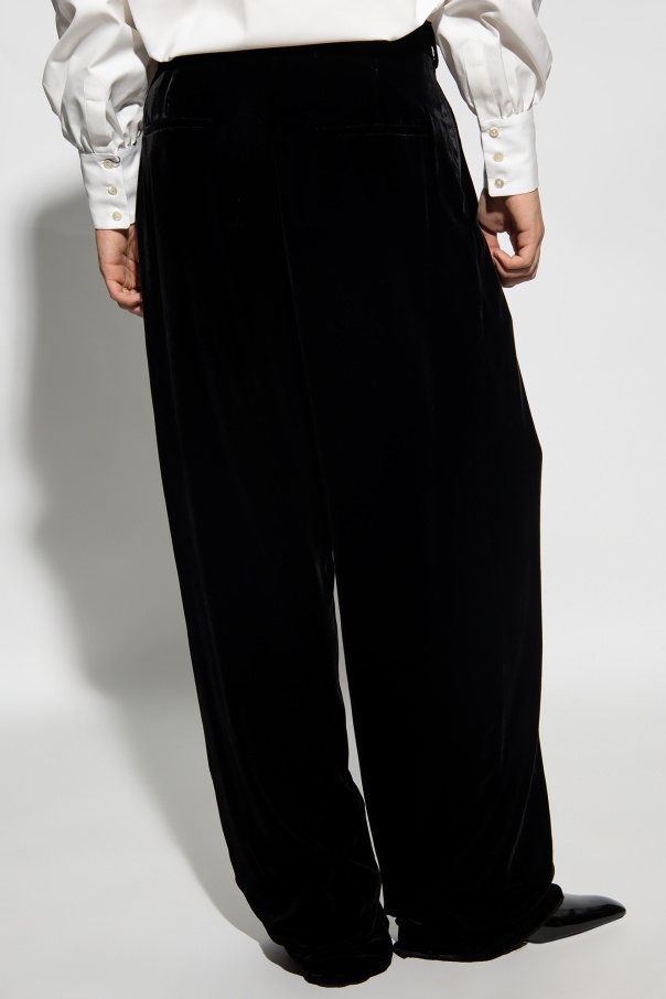 Black trousers from Saint Laurent. Made from velvet fabric, this pair falls with wide, straight legs and features a zip fly with a button and four slip pockets throughout.