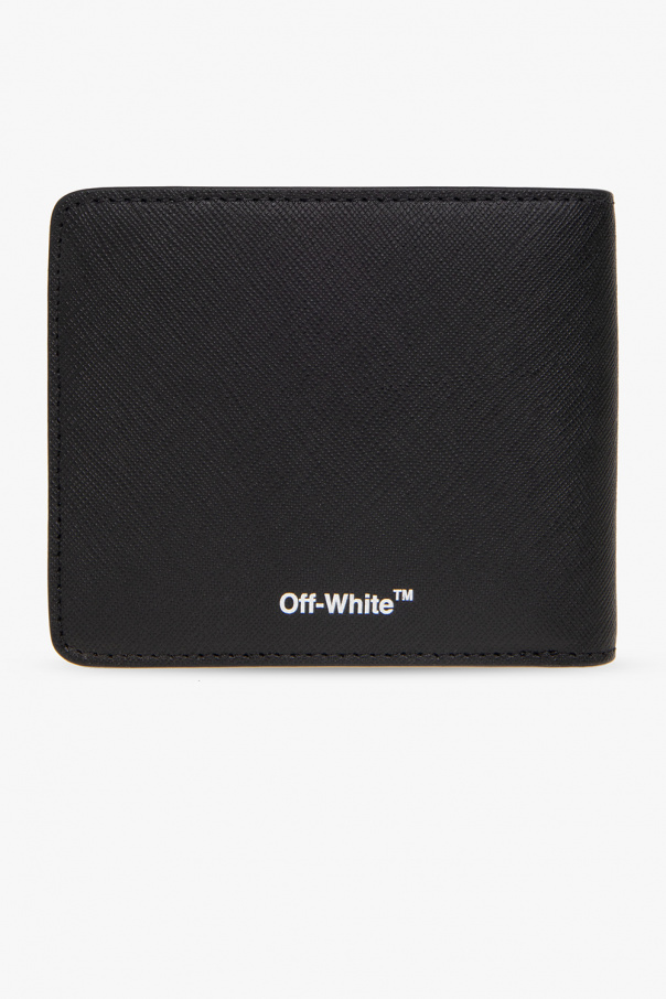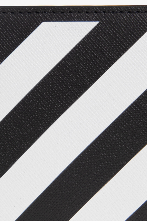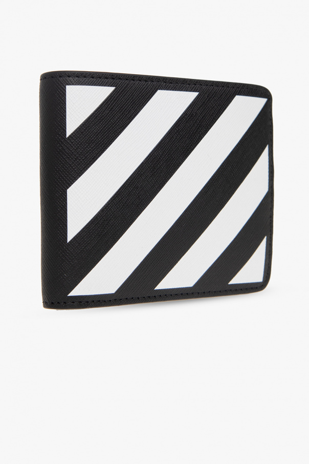 Black bi-fold wallet from Off-White. Crafted from calf leather, this design showcases the brand\'s signature diagonal stripes in white on the front, logo detailing at the back and one bill compartment, two slip pockets and six card slots inside.
