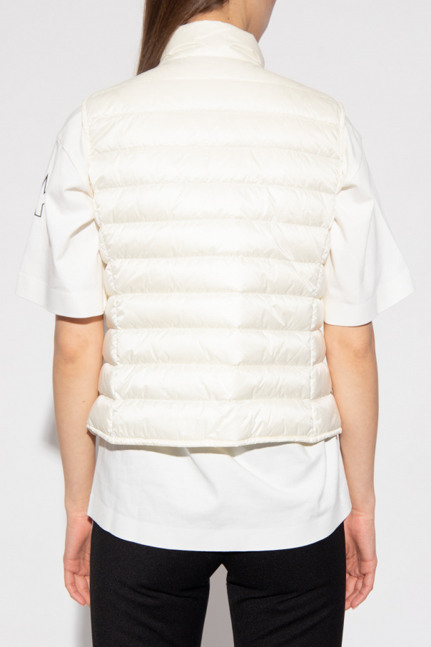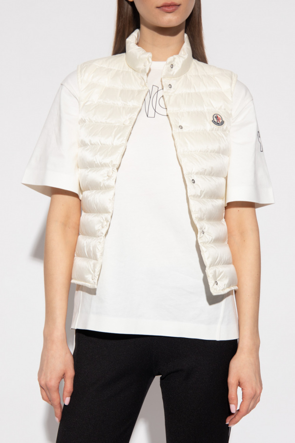 Cream ‘Liane’ down vest from Moncler. Made of light, durable Leger nylon, which makes it perfect for weather transition periods. Fastened with snaps, this garment has a fitted, feminine silhouette, signature Boudin quilting and two vertical zip pockets.