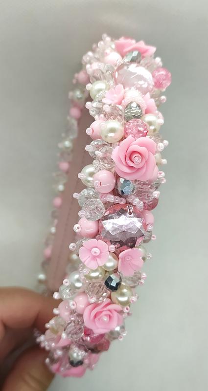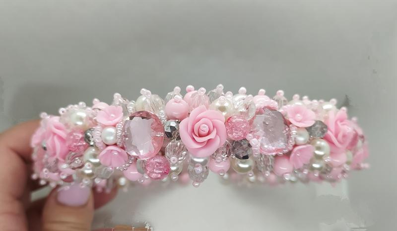 Ободок ручной работы. Все элементы пришиты, изготовлены без использования клея. Розы и бутоны вылеплены из полимерной глины.