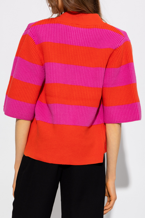 Red and pink ‘EmblaGZ’ cardigan with short sleeves from Gestuz. Made of ribbed fabric, this model features a zip fastening, stripe pattern, short sleeves, high neck and ribbed trims.