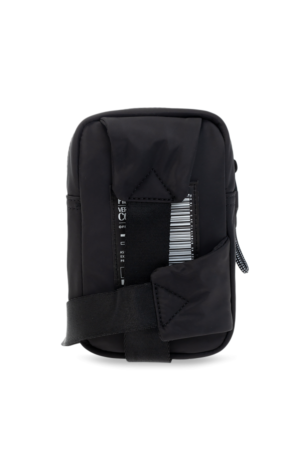 Black belt bag from Versace Jeans Couture. Fastened with a zip, this garment features a white logo pattern, adjustable belt, one internal compartment and black metal hardware.