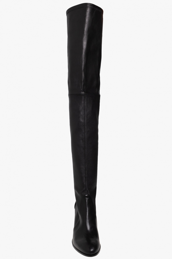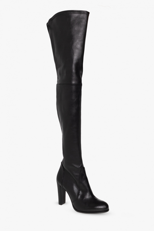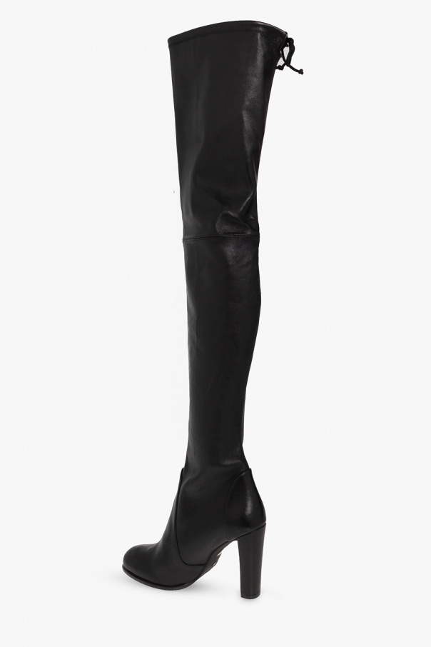 Black ‘Ultra Highland’ heeled boots from Stuart Weitzman. Crafted from leather, this model features a slip-on silhouette, a drawstring hem and a black rubber sole.
