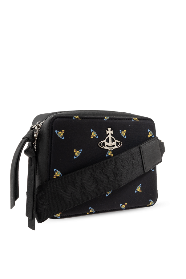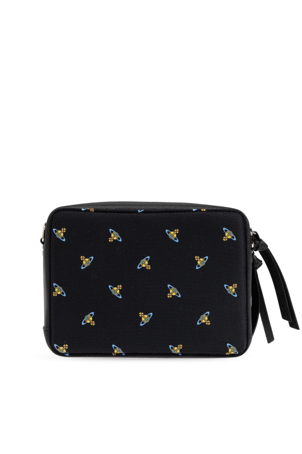 Introducing the Vivienne Westwood Shoulder Bag, an exquisite accessory that epitomizes elegance and practicality. This unisex bag, designed with a sleek black exterior, is adorned with a distinctive pattern of small, colorful graphics depicting a ringed planet and cross—an iconic motif of the renowned designer. Crafted from a blend of high-quality materials, including polyamide, polyurethane, polyester, and elastane, the bag boasts a smooth, durable texture. Its rectangular shape with rounded edges and robust, wide shoulder strap, partially emblazoned with the \"WESTWOOD\" insignia, ensures both style and comfort. The front of the bag is accented with a silver-toned metal logo, adding a touch of sophistication. The dual zipper closure is complemented by additional material pulls for ease of use. Inside, the bag features a well-finished interior with the designer\'s label, a slip pocket, and three card slots, offering ample space for your essentials. Why Choose This Product? Iconic Design: Features Vivienne Westwood\'s signature motif and logo. High-Quality Materials: Made from a durable blend of polyamide, polyurethane, polyester, and elastane. Versatile Use: Suitable for both men and women, and can be worn on the shoulder or crossbody. Practical Interior: Includes a slip pocket and three card slots for organized storage. Elegant Details: Silver-toned logo and dual zipper with material pulls enhance functionality and style.