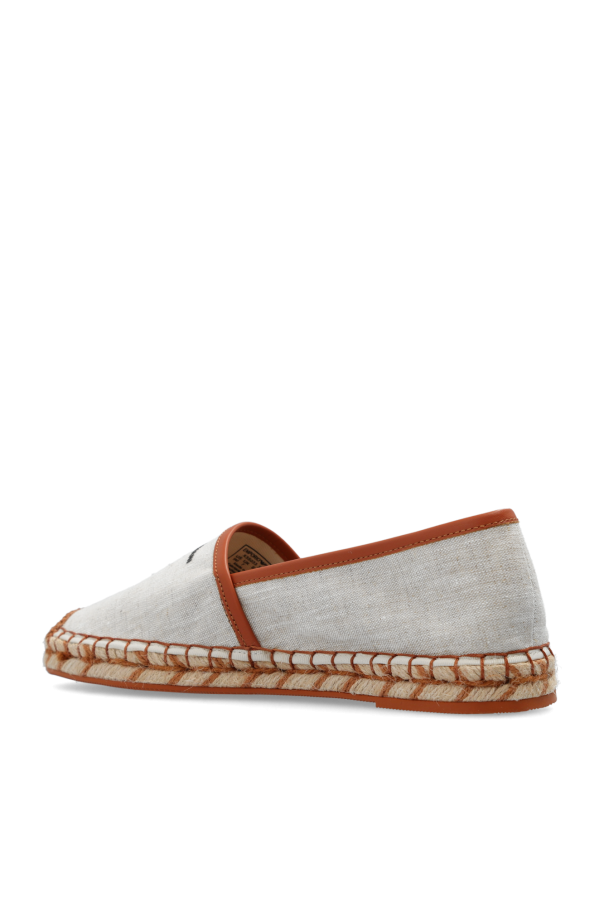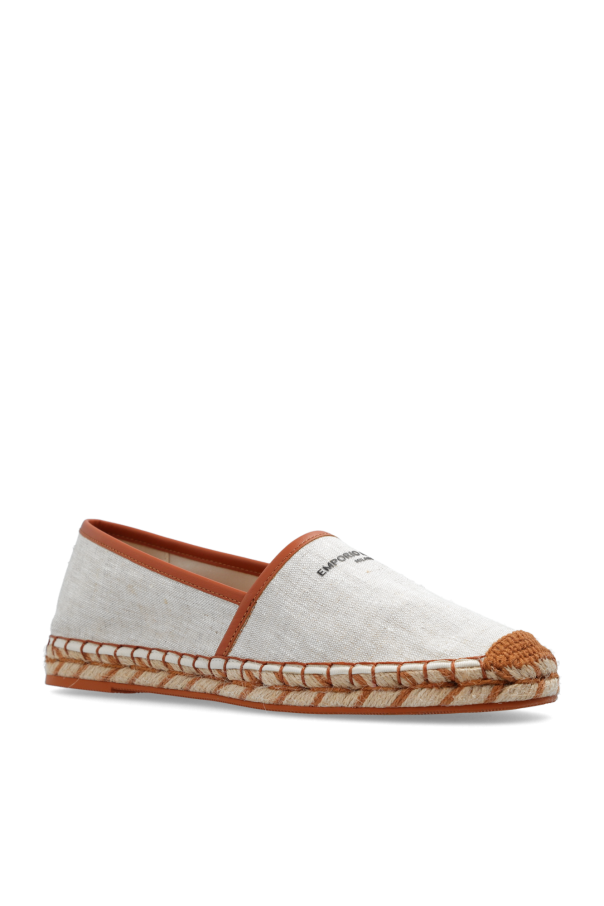 Beige and brown espadrilles from Emporio Armani. Made from cotton finished with leather, this model sits on a woven jute sole with brown rubber trim and showcases a round toe and a black logo on the front.