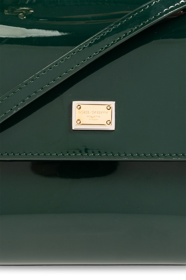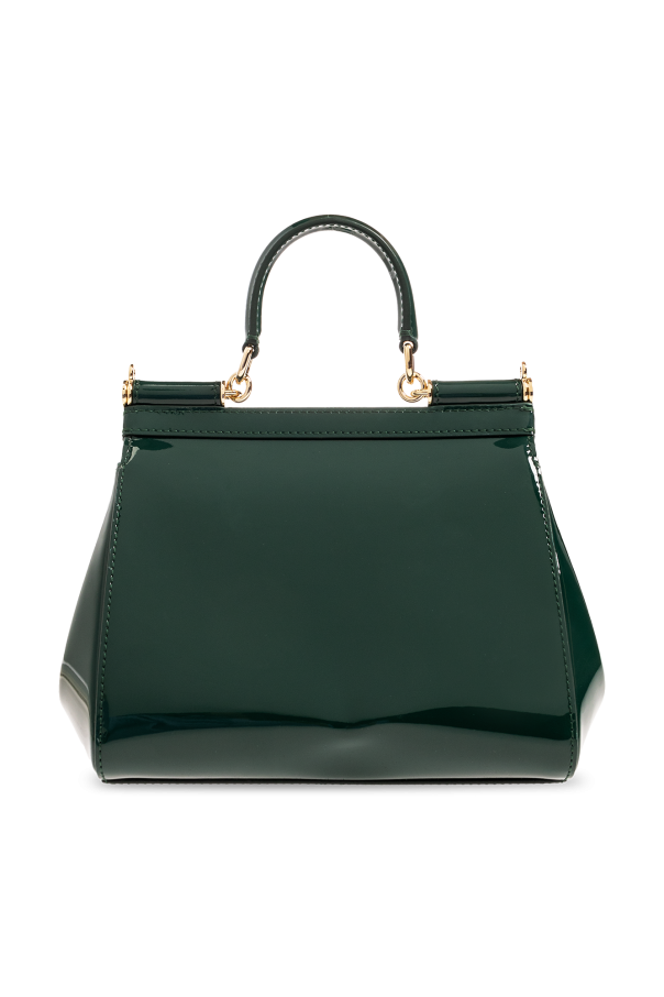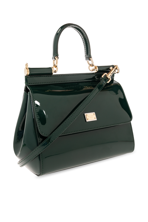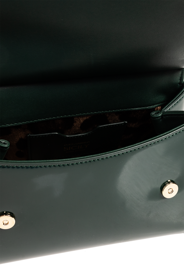 Dark green ‘Sicily Medium’ shoulder bag from Dolce & Gabbana. Made of glossy calf leather, this design secures with snaps and showcases a logo-engraved metal application on the front. It is complete with a detachable and adjustable shoulder strap, one half-round handle, gold-tone metal hardware and one internal compartment with one slip pocket and one card slot.