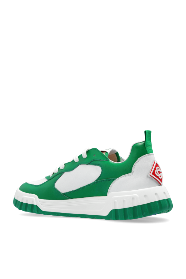 Introducing the ‘Court’ Sport Shoes by Casablanca, a harmonious blend of heritage charm and contemporary flair. Crafted with meticulous attention to detail, these sneakers feature a luxurious leather exterior adorned with vibrant green, accented by pristine white details on the front and sides, punctuated by spirited orange highlights on the laces and the designer\'s emblematic side logo. The robust rubber sole, with its distinctive serrated pattern, offers not only a modern aesthetic but also superior traction, ensuring both style and functionality. The sole\'s lighter green hue complements the upper\'s rich color, creating an eye-catching contrast. These shoes are equipped with flat, white laces that strikingly contrast against the green, enhancing the visual appeal. The model name \"Court\" and the Casablanca logo grace the tongue, signifying exclusivity, while a subtle logo at the back and a handy pull loop facilitate easy wear. Why Purchase This Product? Exclusive Design: Classic yet modern, with distinctive green and white colors, and orange accents, embodying the unique Casablanca aesthetic. Premium Materials: High-quality leather construction ensures durability and comfort. Functional Elegance: The serrated rubber sole provides both an edgy look and enhanced grip. Attention to Detail: From the contrasting laces to the designer logos, every element accentuates its exclusivity.