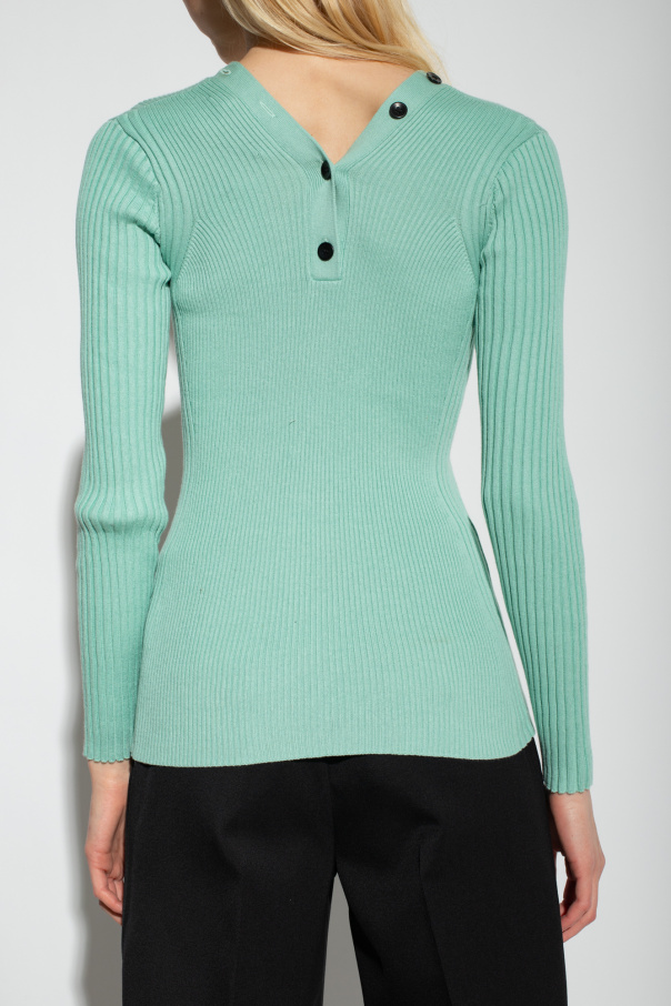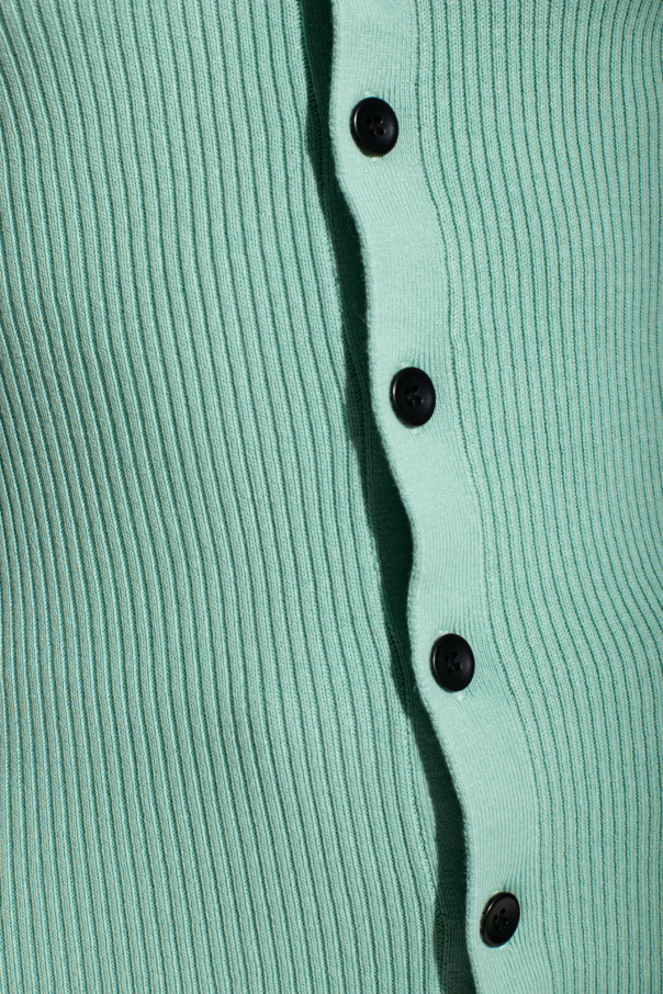Light green cardigan from Proenza Schouler White Label. Crafted from a cotton and cashmere blend with a ribbed texture, this style features a fitted silhouette with a V-neckline, long sleeves and black button fastenings on the front and back.