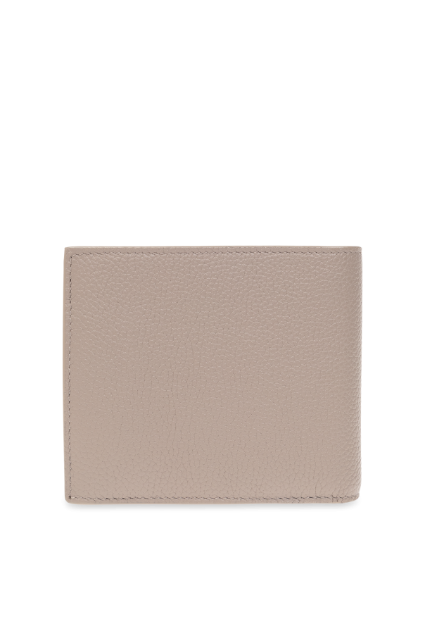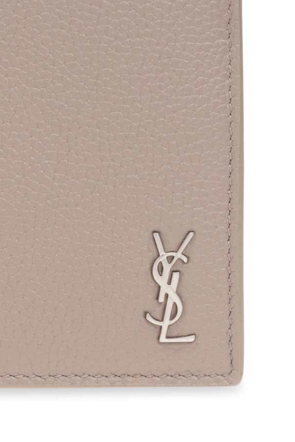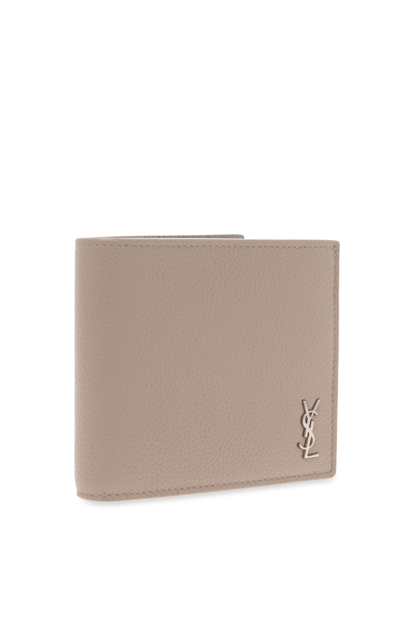 Greyish beige folding wallet from Saint Laurent. Made of calf leather, this item features a metal logo and has two bill compartments, one snap-fastened coin pocket, two slip pockets and four card slots inside.