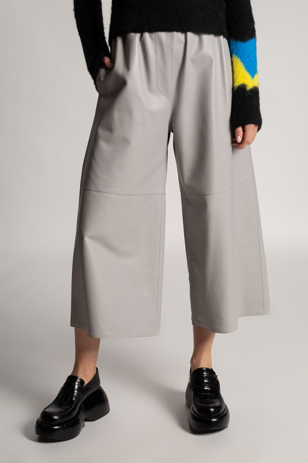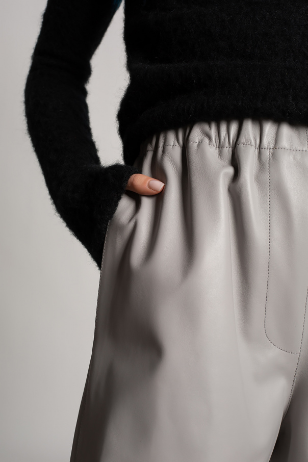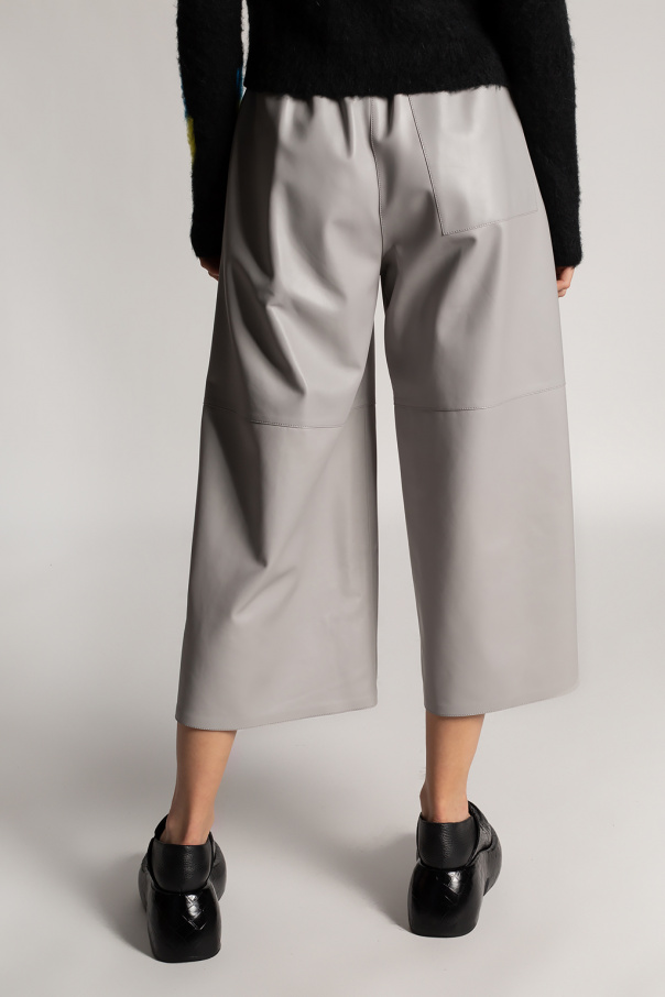 Grey trousers from Loewe. Crafted from lamb leather, this pair falls down with wide legs and features an elasticated waistband and three slip pockets.