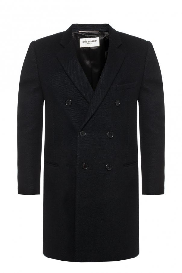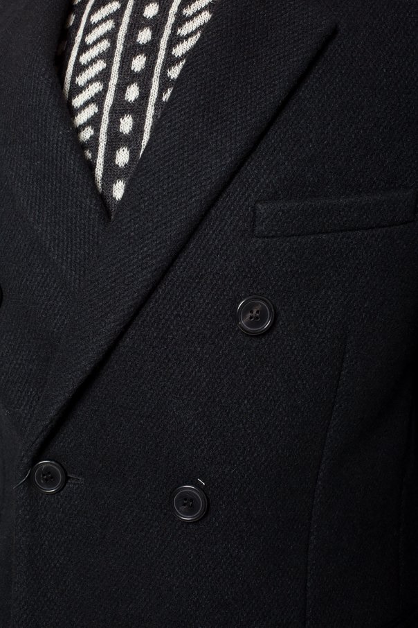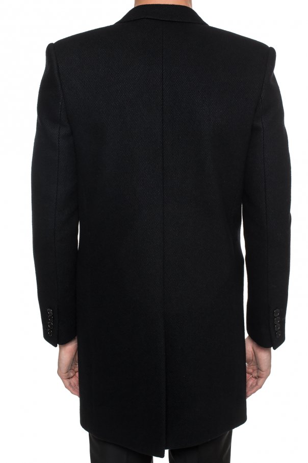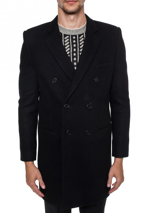 Black double-breasted coat with notch lapels from Versace Jeans Couture. Made of wool. Fastened with buttons. It features 2 slip pockets on the front and single split vent on the back.