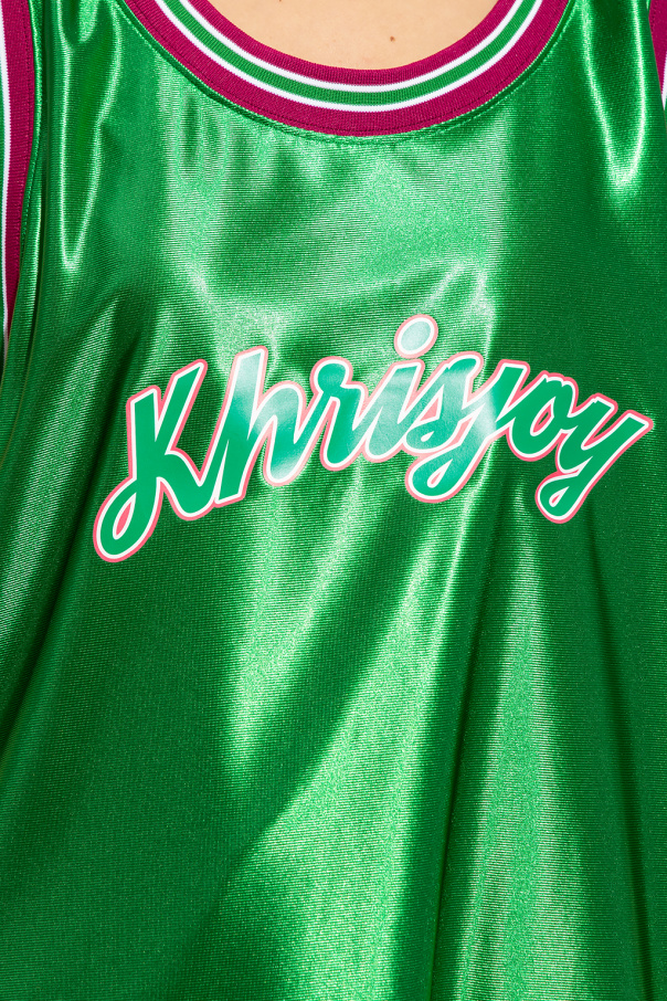 Green crewneck tank top from Khrisjoy. Embellished with a pink, white and green graphic pattern with the brand's logo, this style features an elasticated collar and decorative snap closures on the sides.