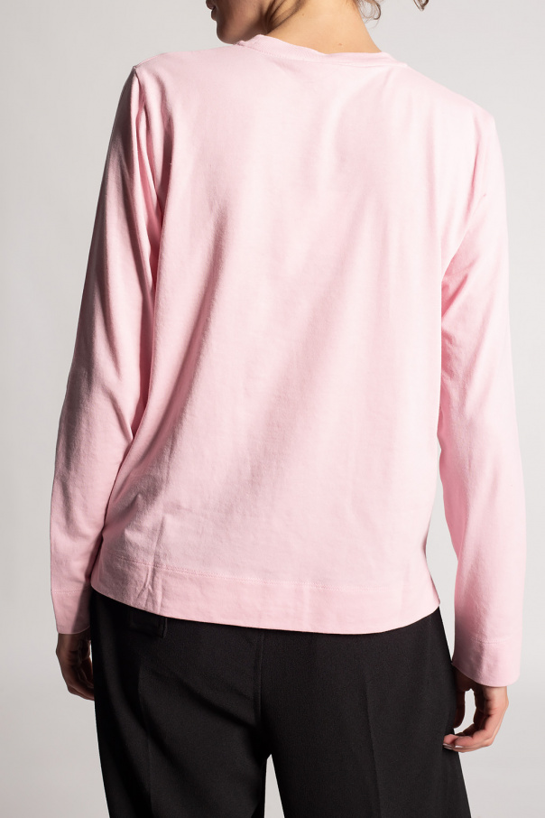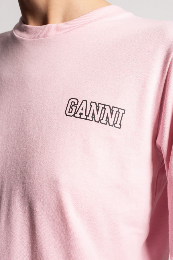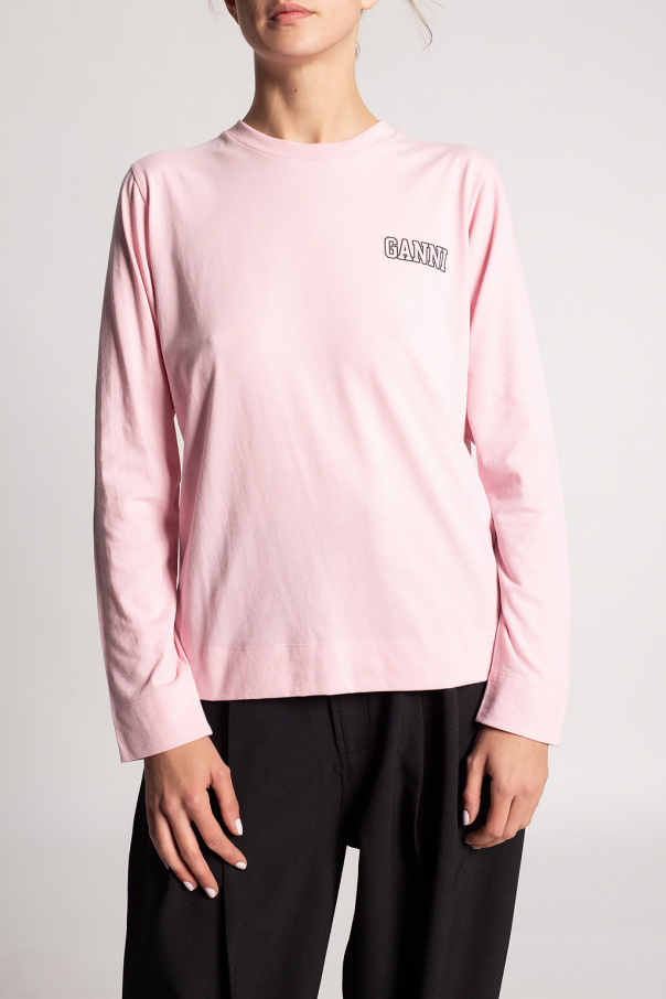 Light pink T-shirt from Ganni. This long sleeve design features a dark grey logo print and ribbed crewneck.