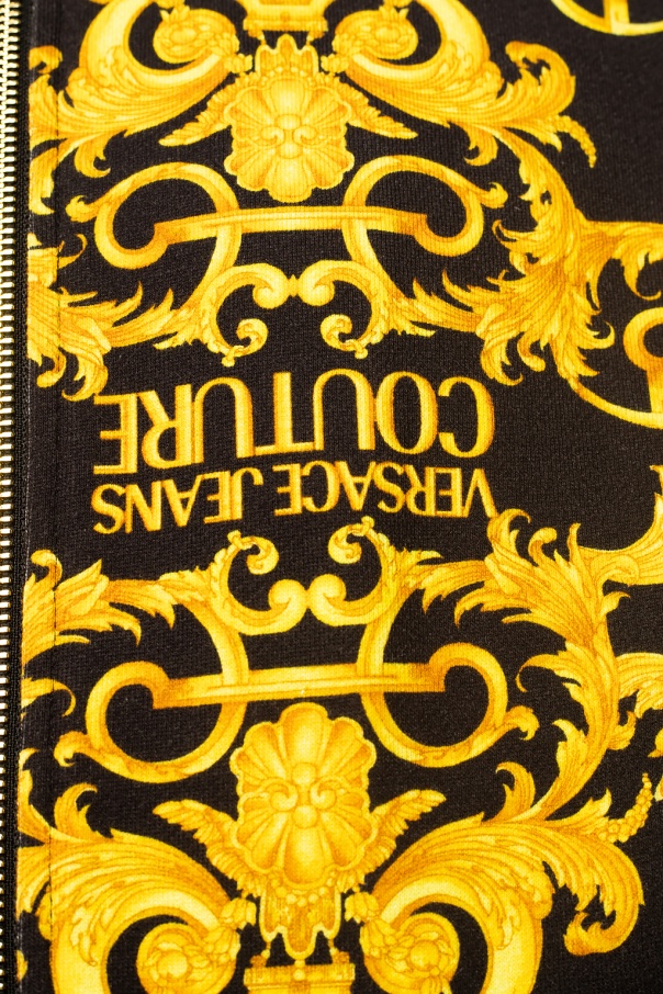 Black sweatshirt with a drawcord-adjustable hood from Versace Jeans Couture. Enriched with the brand\'s iconic Barocco print with an accompanying logo in yellow, this cotton-crafted hoodie fastens via a zip and employs two slip pockets and a ribbed bottom hem and cuffs.