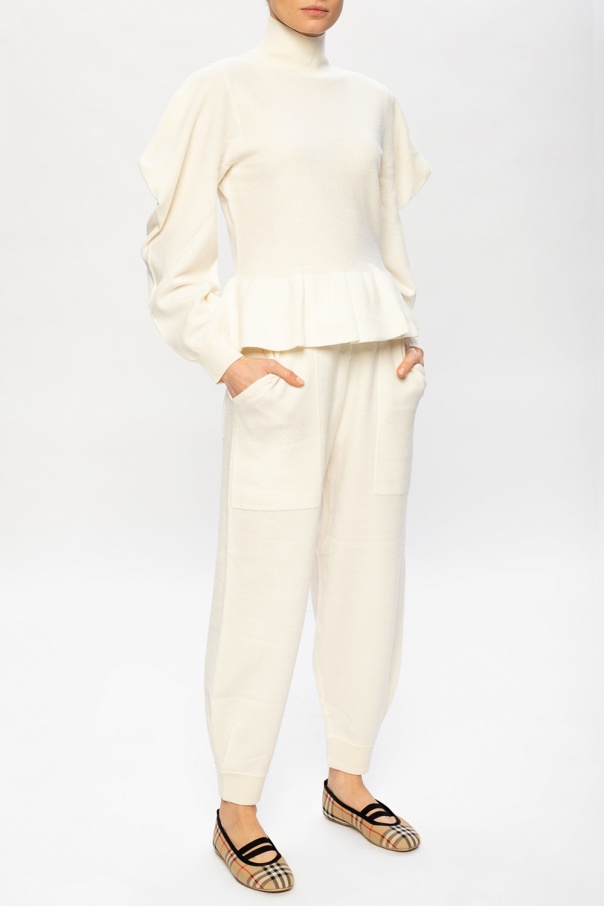 Cream ‘Rosa’ turtleneck sweater with decorative shoulders from Ulla Johnson. Crafted from merino wool, this design is enriched by ruffles and ribbed trims at the hem and cuffs.