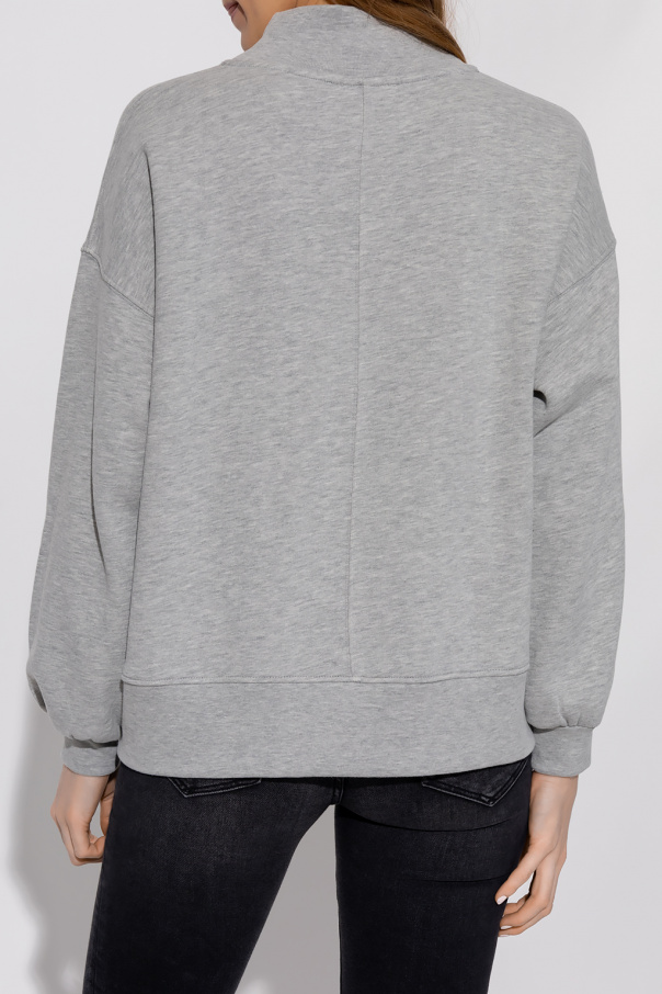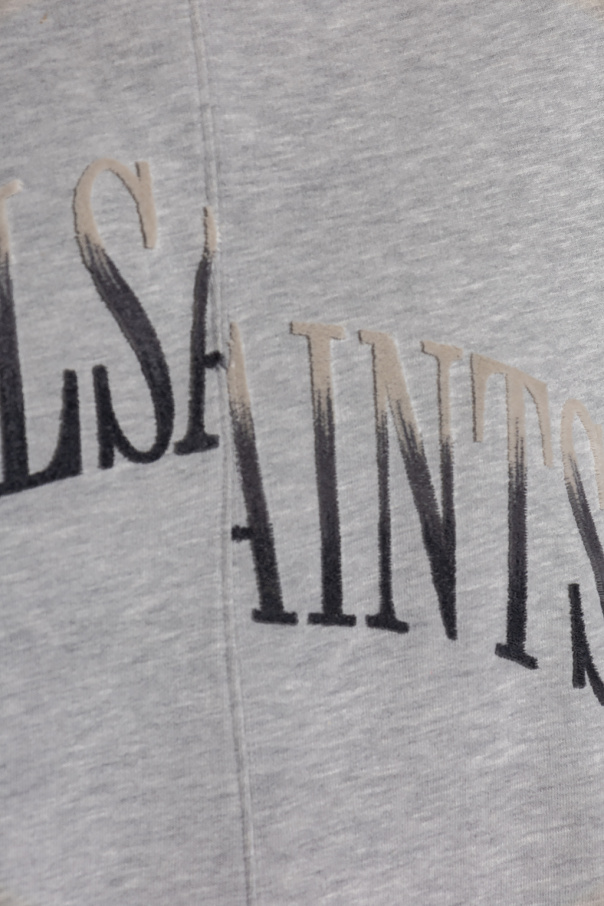 Grey ‘Nevarra’ sweatshirt from AllSaints. Crafted from recycled materials, this style features a relaxed silhouette, a velour-flocked logo application and elasticized trims on the standing collar, bottom hem and cuffs.