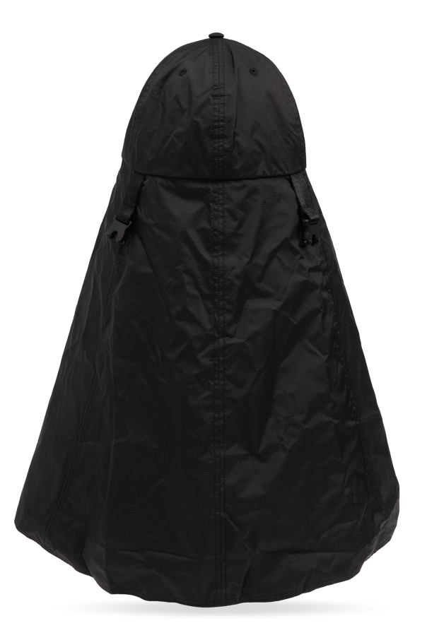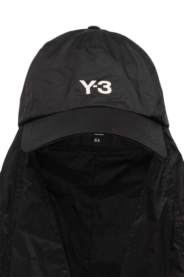 Black baseball cap from Y-3 Yohji Yamamoto. Made from ripstop material, this item showcases a printed white logo on the front. The neck guard has adjustable straps with snap closures.